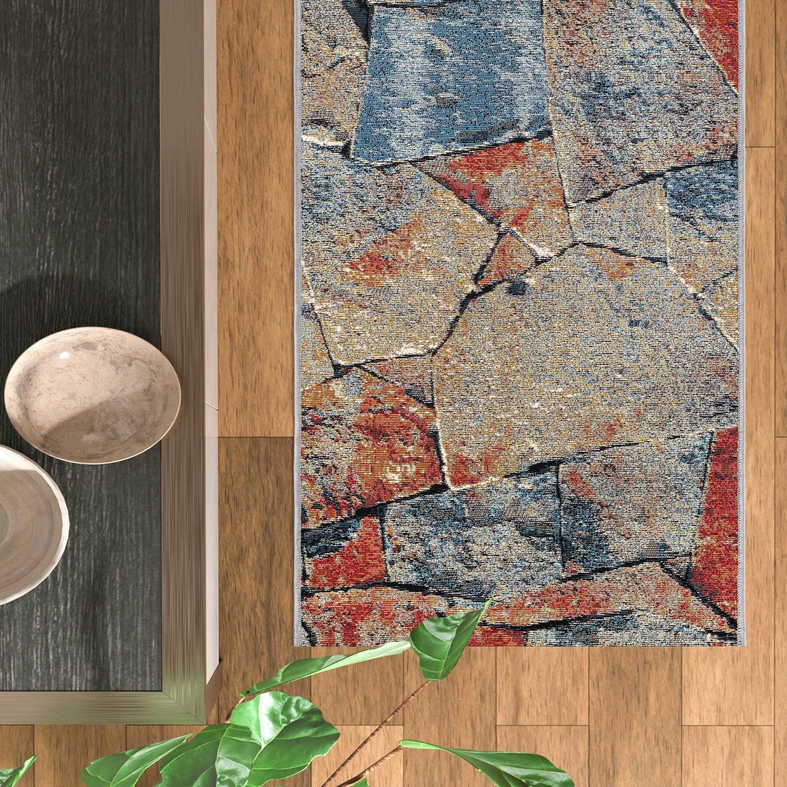 A multi-colored 6 ft runner rug with a modern abstract stone or mosaic pattern, ideal for a hallway or patio.