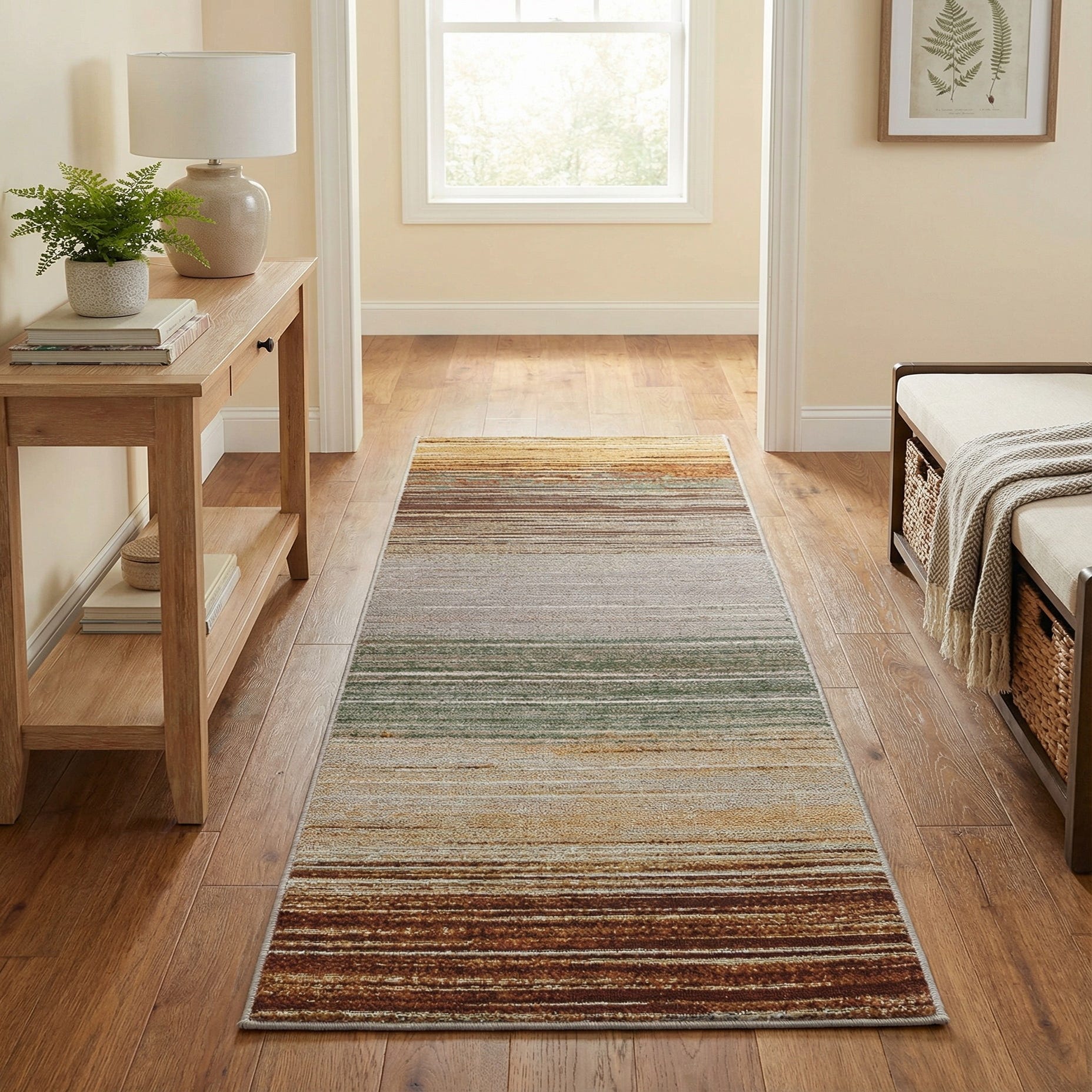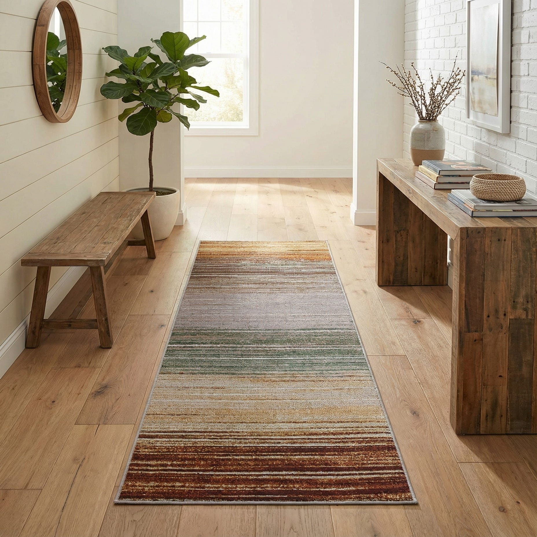 This runner works well in narrow spaces where a long visual line is needed: hallways, entries, or alongside kitchen cabinets. It pairs nicely with warm wood floors, leather or mid-century furniture, and neutral upholstery, and also complements rooms with green plants or burgundy accents. Use it on a covered porch or mudroom for color and pattern that coordinates with mixed-material décor and modern or transitional interiors.