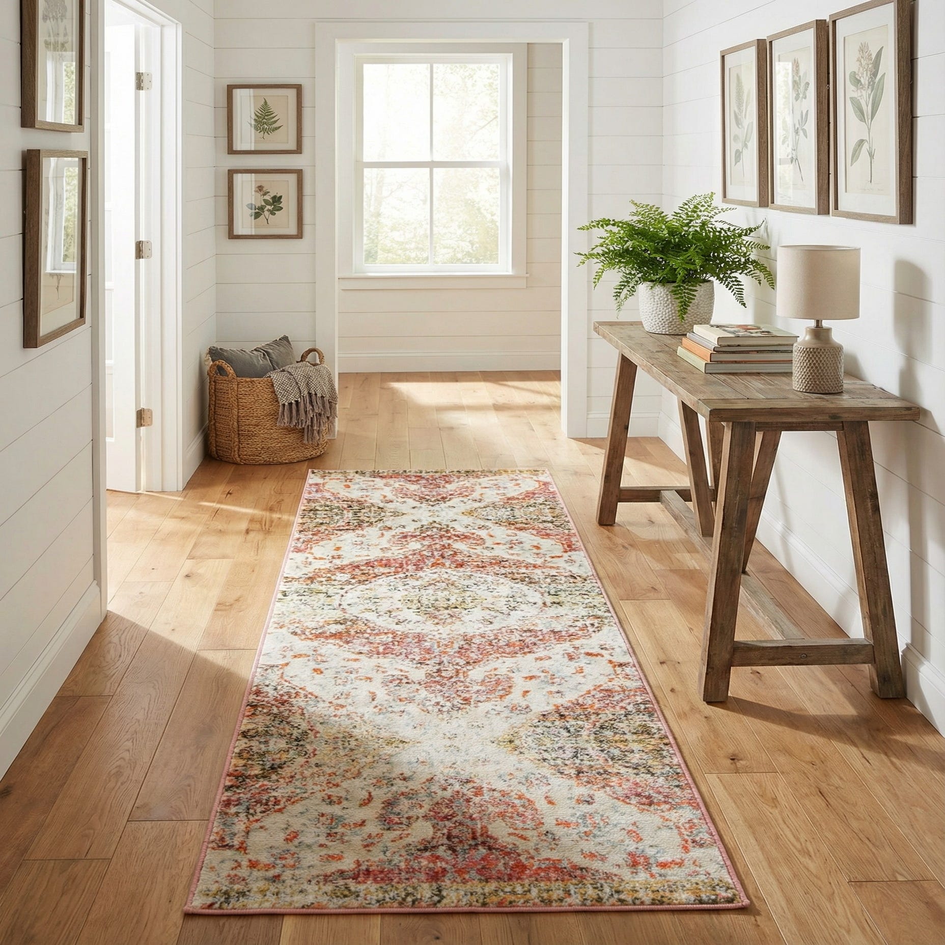 Machine made from 100% polypropylene with space-dyed yarn, the rug has a low, slightly plush texture that is comfortable underfoot and displays subtle color variation from the dye process. Place it in a busy hallway or entry to add color without overwhelming a narrow space, layer it in front of a sofa to introduce warmth and pattern, or use it in a bedroom or home office to tie together eclectic or modern farmhouse schemes. Its balanced palette also works well with coastal-inspired blues or muted neutrals.