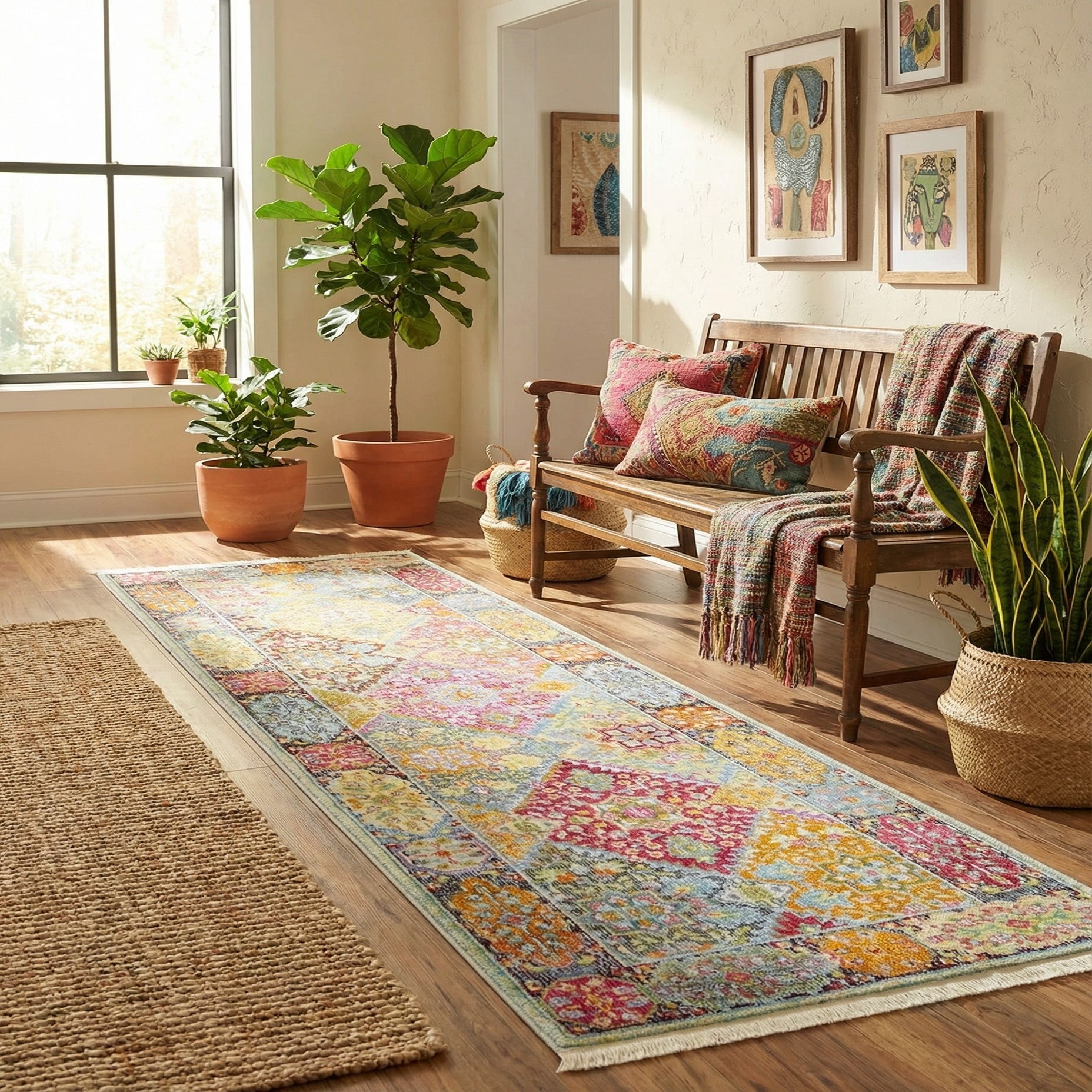Place this runner in a bright hallway or entry to introduce color and pattern without heavy visual weight, or use it to define a narrow kitchen galley or the run alongside a bed. It pairs well with light wood floors, painted furniture and woven textures for a relaxed, eclectic or cottage-style room, and can also complement deeper accent pieces—think burgundy pillows or aged-gold accessories—to bring cohesion to a layered, collected interior.