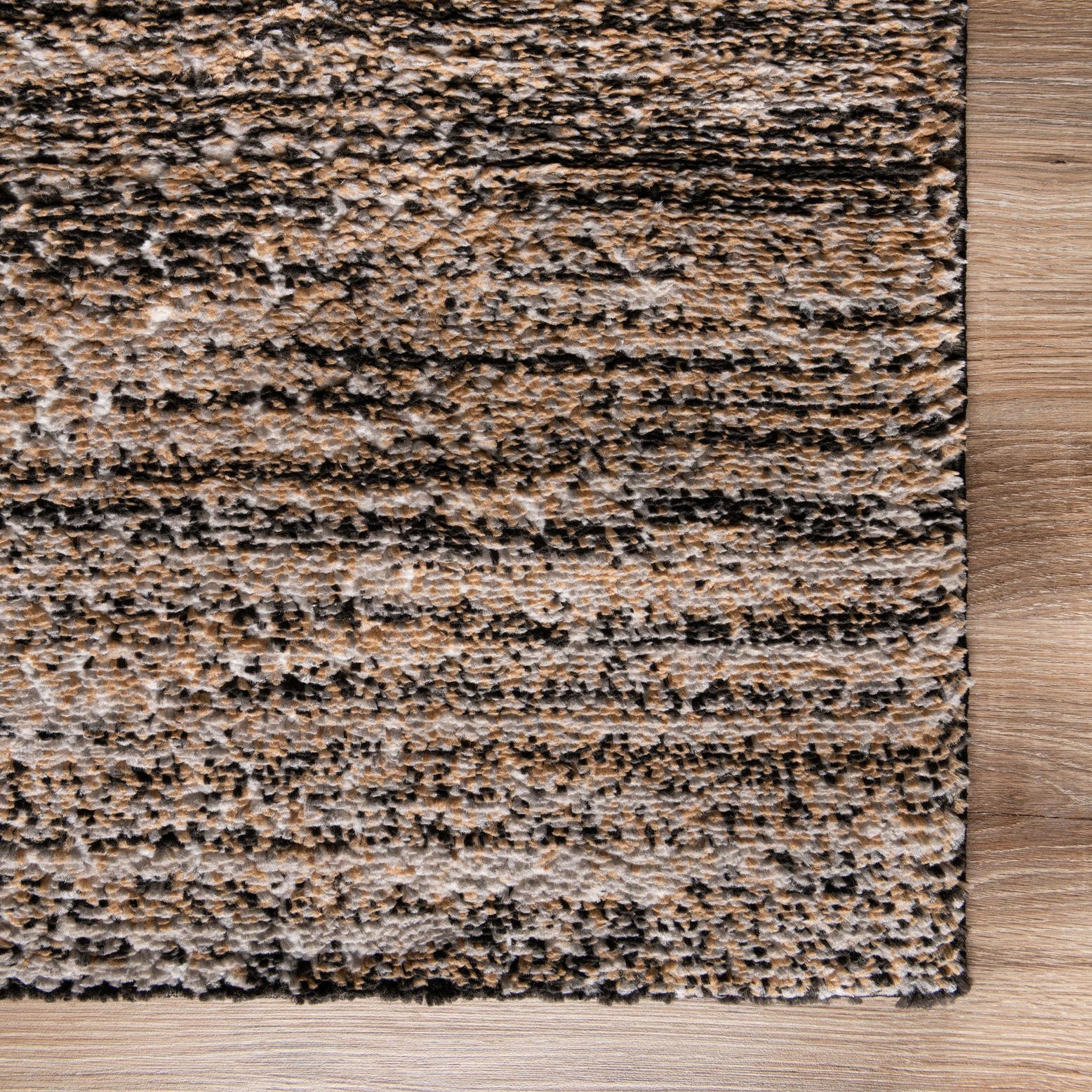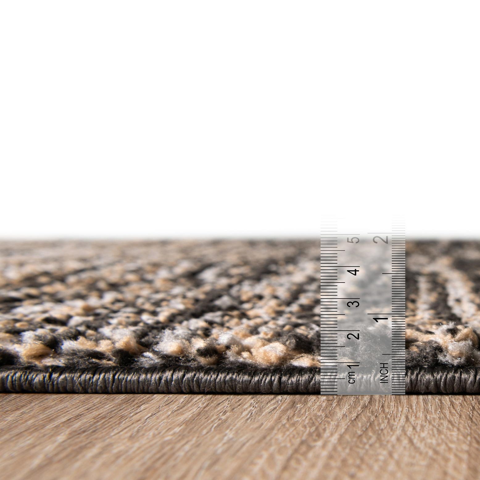 A 6 ft runner rug with a modern abstract pattern in multi-colored tones of black, white, and tan, ideal for a hallway.