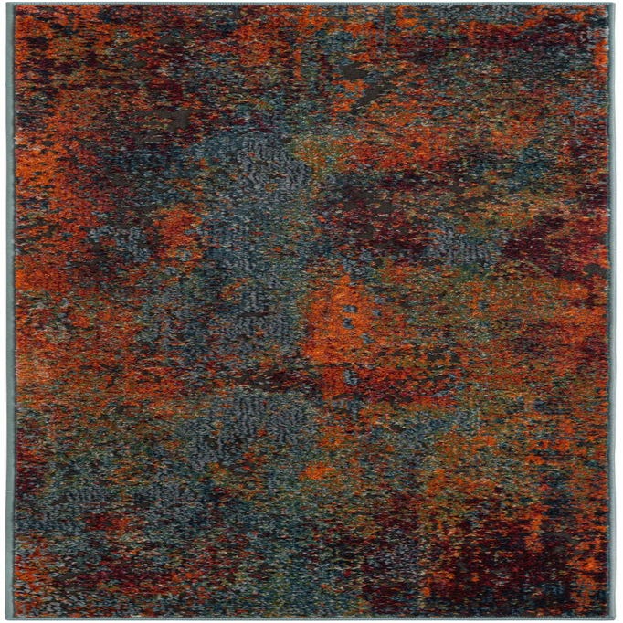 A 6 ft multi-colored runner rug with an abstract, mottled pattern in shades of orange, blue, and dark red.