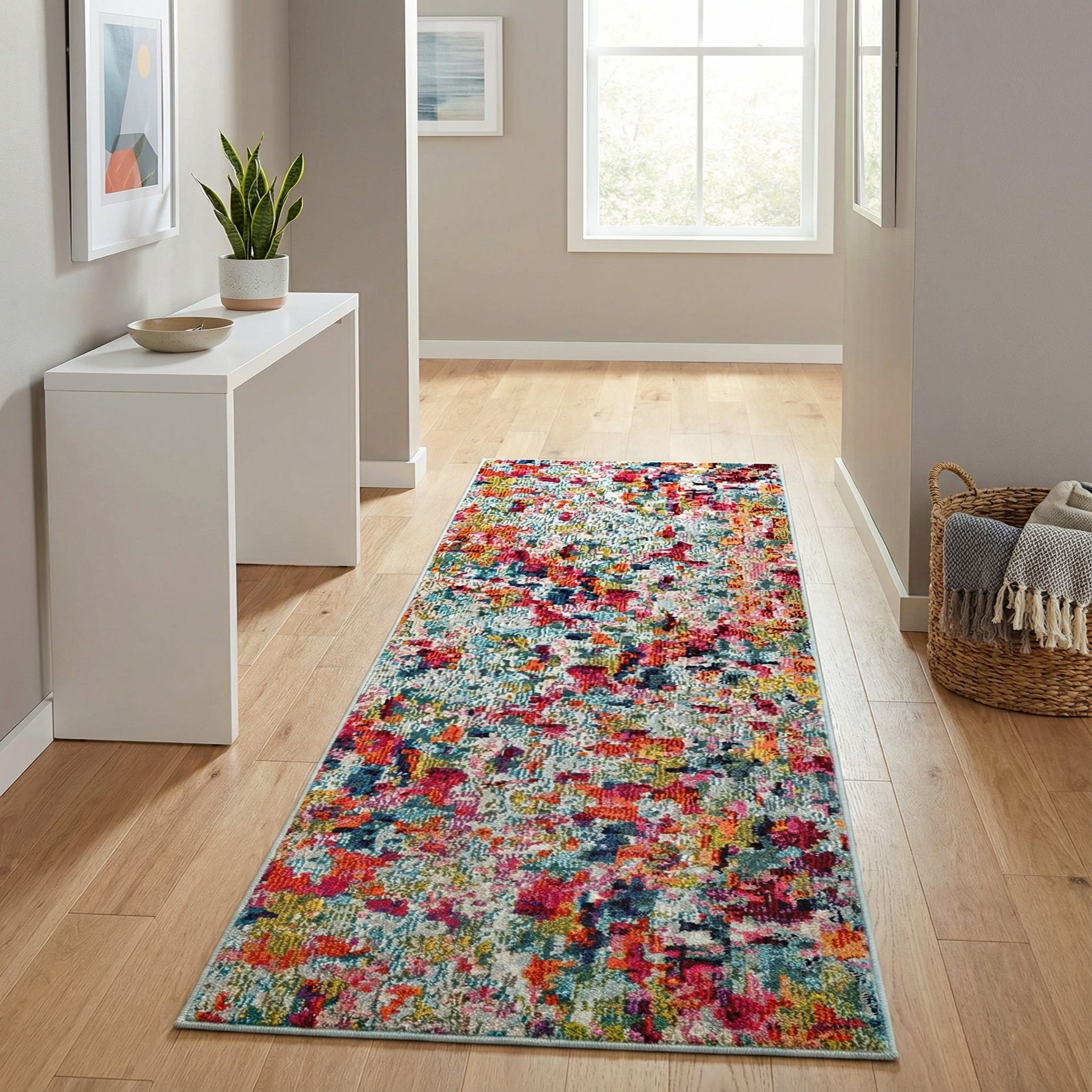 This runner brings energy to narrow spaces: use it to enliven a hallway, guide the flow through an entryway, or add color along a kitchen corridor. It pairs well with clean-lined, modern furnishings to introduce a bold focal point, or layered with natural woods and woven textiles for a relaxed, bohemian feel. Match it with neutral upholstery to let the colors pop, or pull accent tones from the rug — teal, gold or pink — into pillows and artwork for a coordinated look.