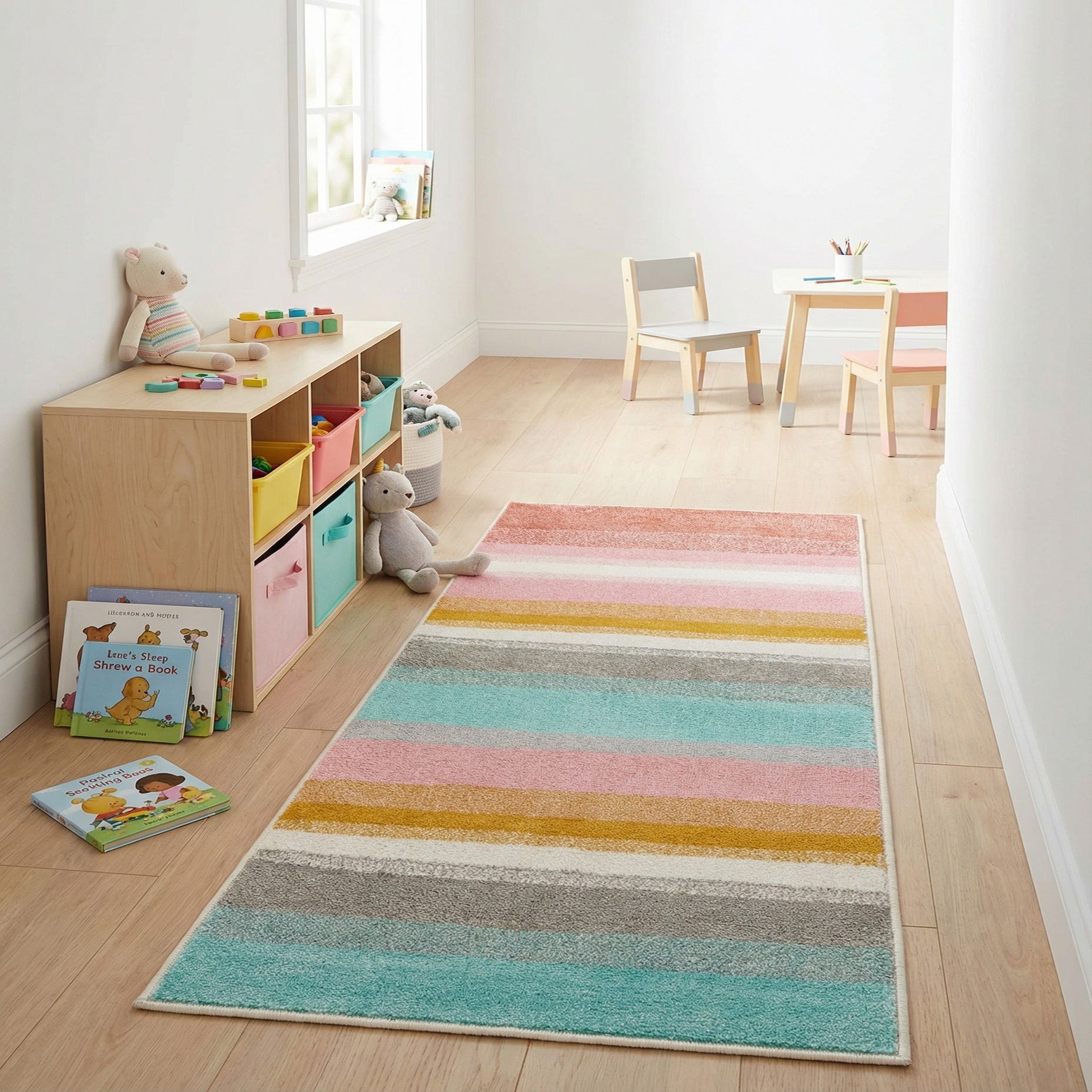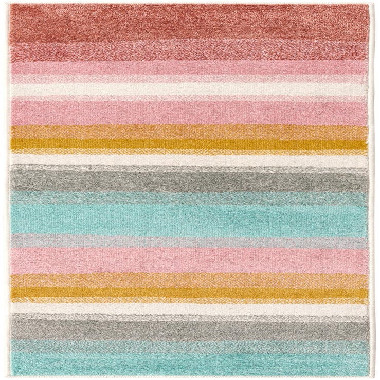 The Whimsy Kids collection runner rug boasts a playful and contemporary design, featuring a series of horizontal stripes that create a sense of movement and energy. The color palette includes a cheerful mix of ivory, yellow, pink, gray, and light blue set against a vibrant multi-colored background. Crafted from 100% polypropylene, the rug offers durability and is both stain-resistant and shed-free, making it an ideal choice for high-traffic areas and children's spaces where ease of maintenance is a priority.