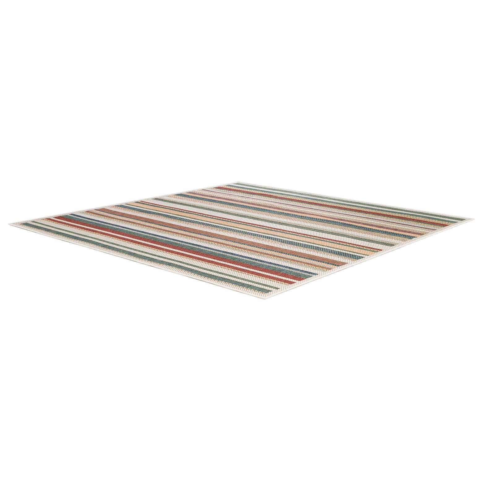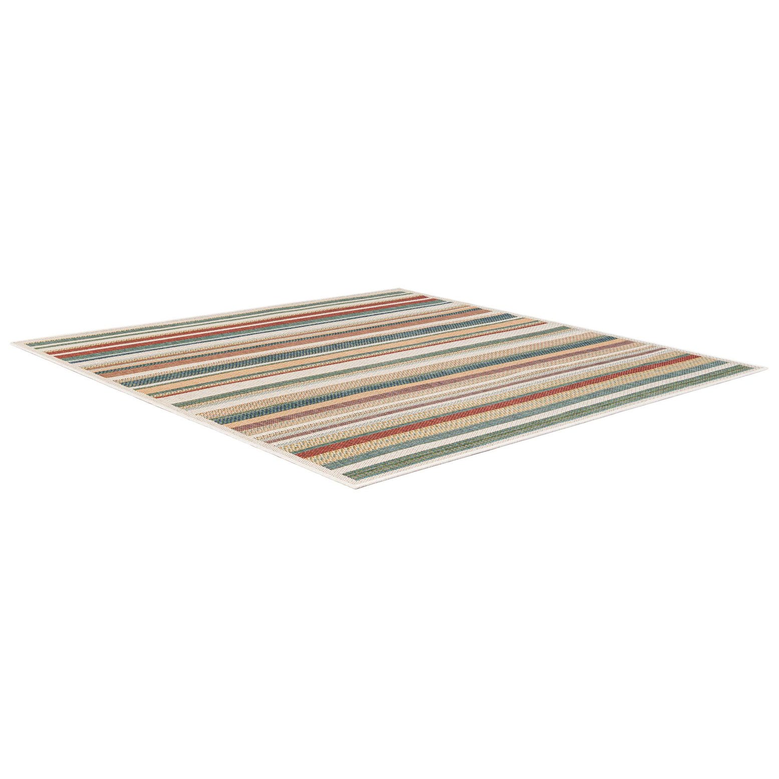 A 6'x6' square multi-colored modern stripe flatweave rug, featuring thin bands of red, blue, green, and beige.