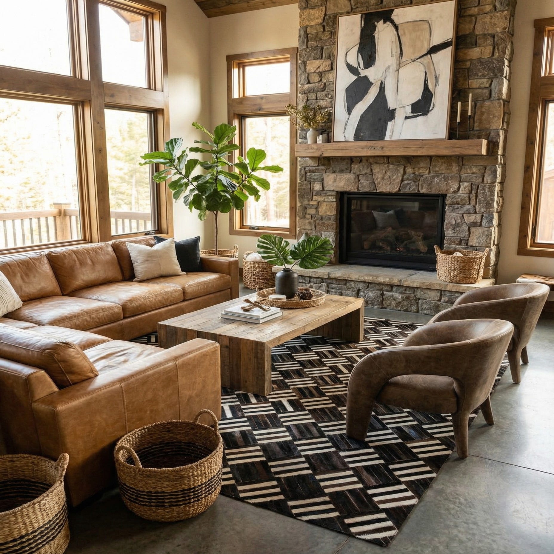 A square, multi-colored cowhide rug featuring a modern geometric pattern of interwoven dark brown and striped white leather squares.