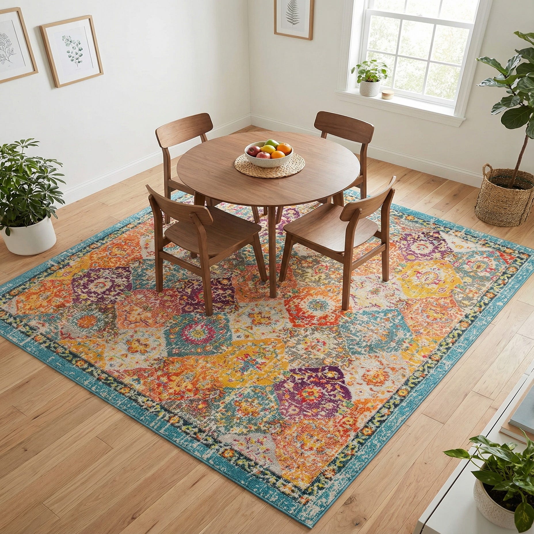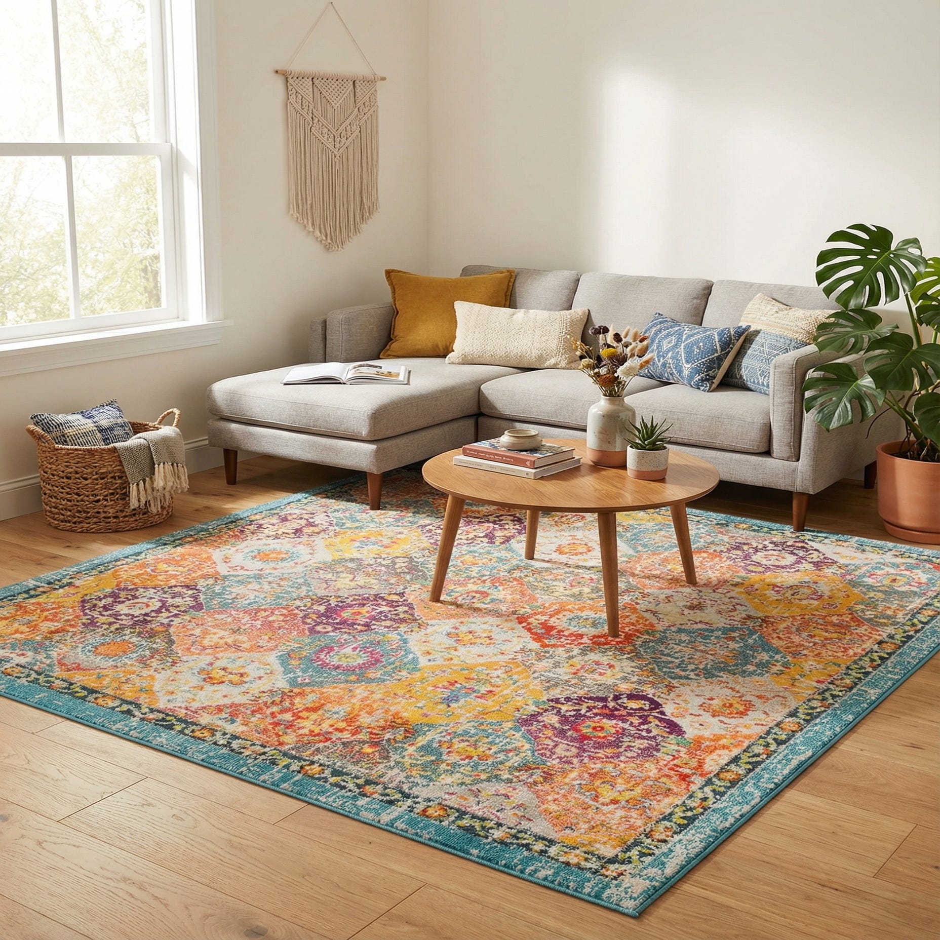 Primary color is Multi. Colors in this rug include: Multi, Blue, Gold, Gray, Green, Navy Blue, Orange, Peach, Purple, Red, Yellow, Pink.