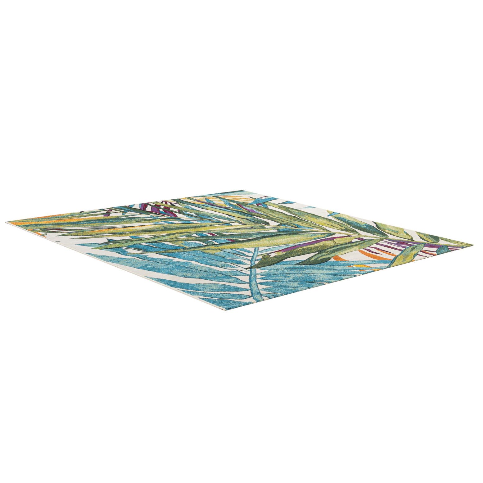 A square multi-colored rug with a modern botanical pattern, featuring large green, blue, and purple palm leaves on a light background.