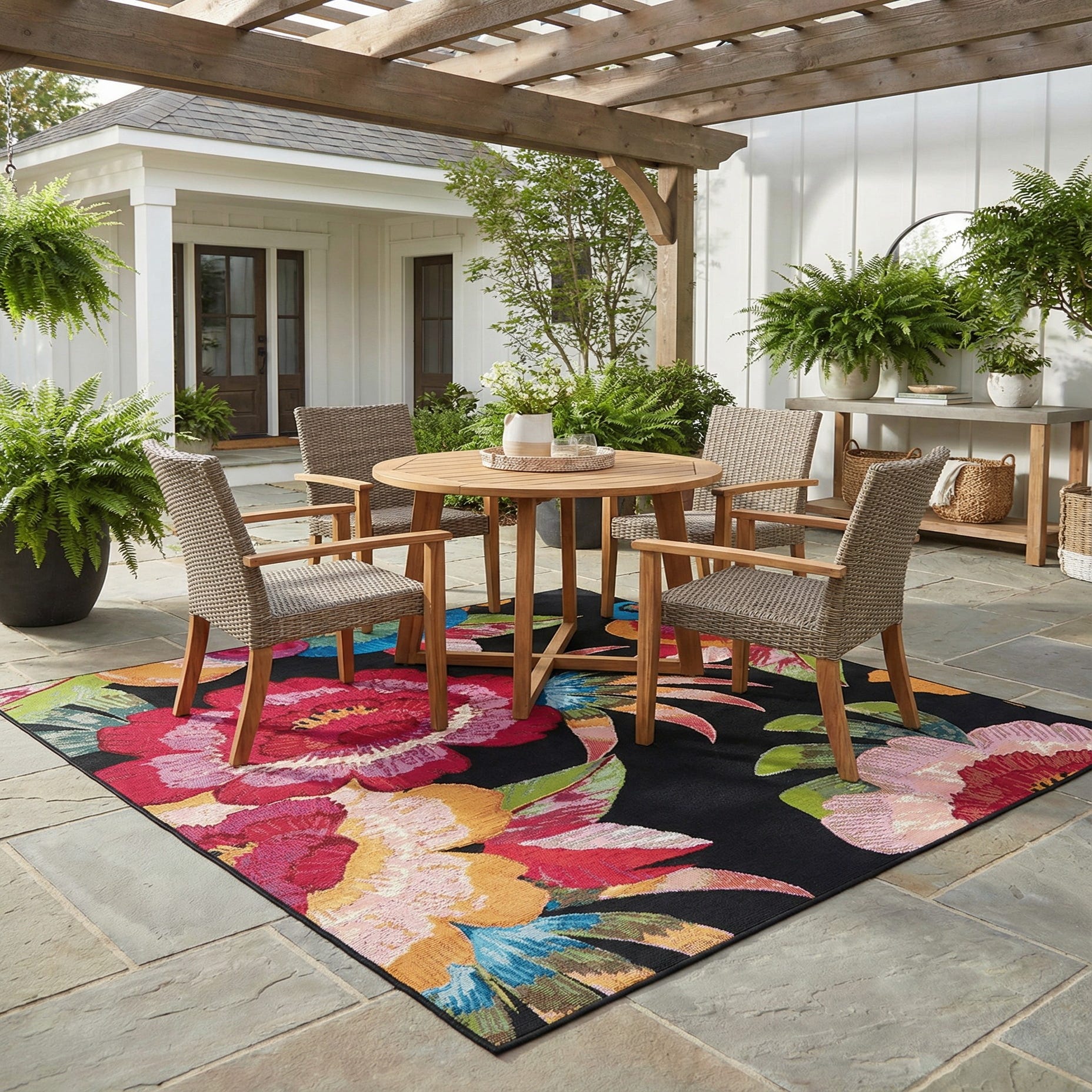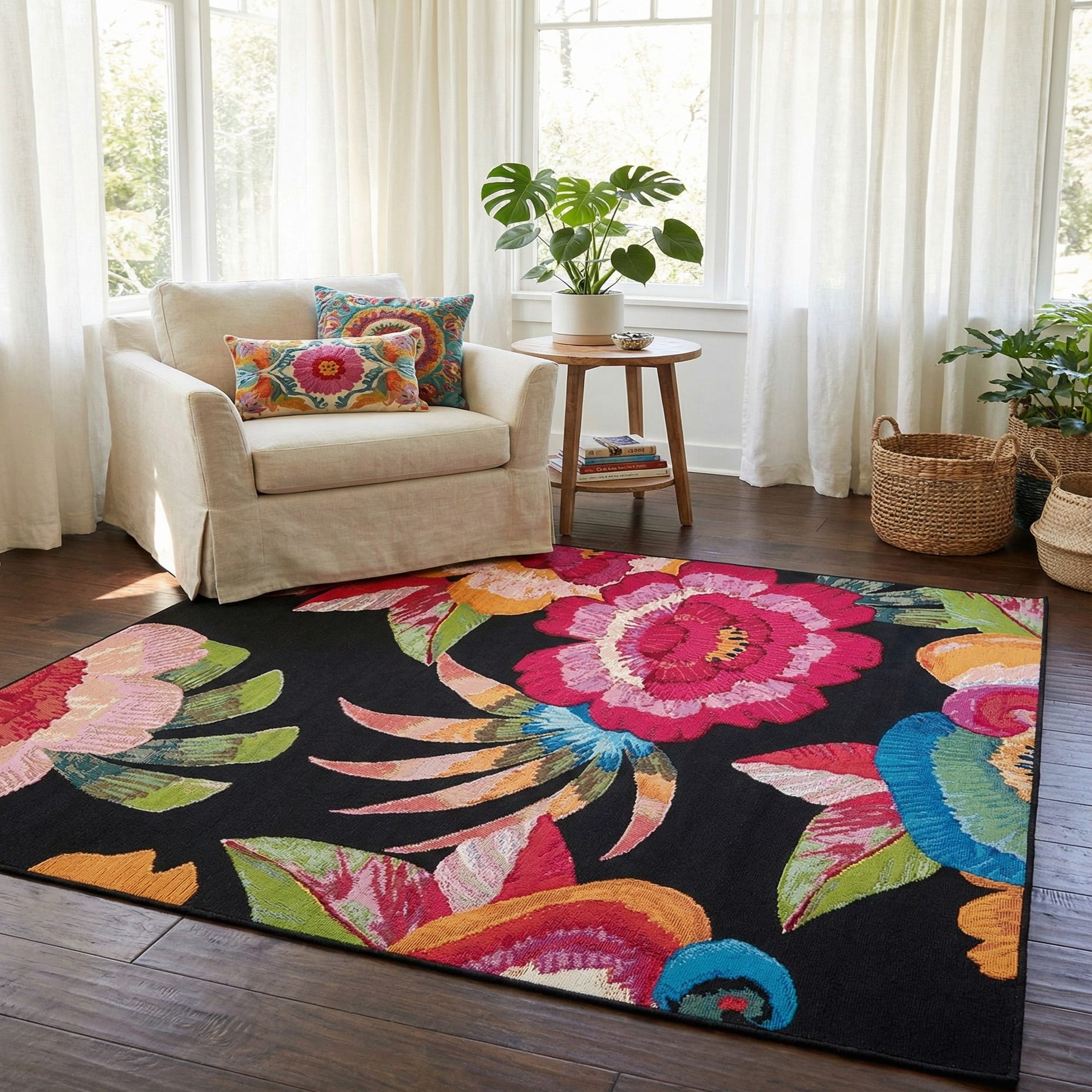 A vibrant 6'x6' square indoor/outdoor rug featuring large, multi-colored modern floral and botanical patterns on a black background.