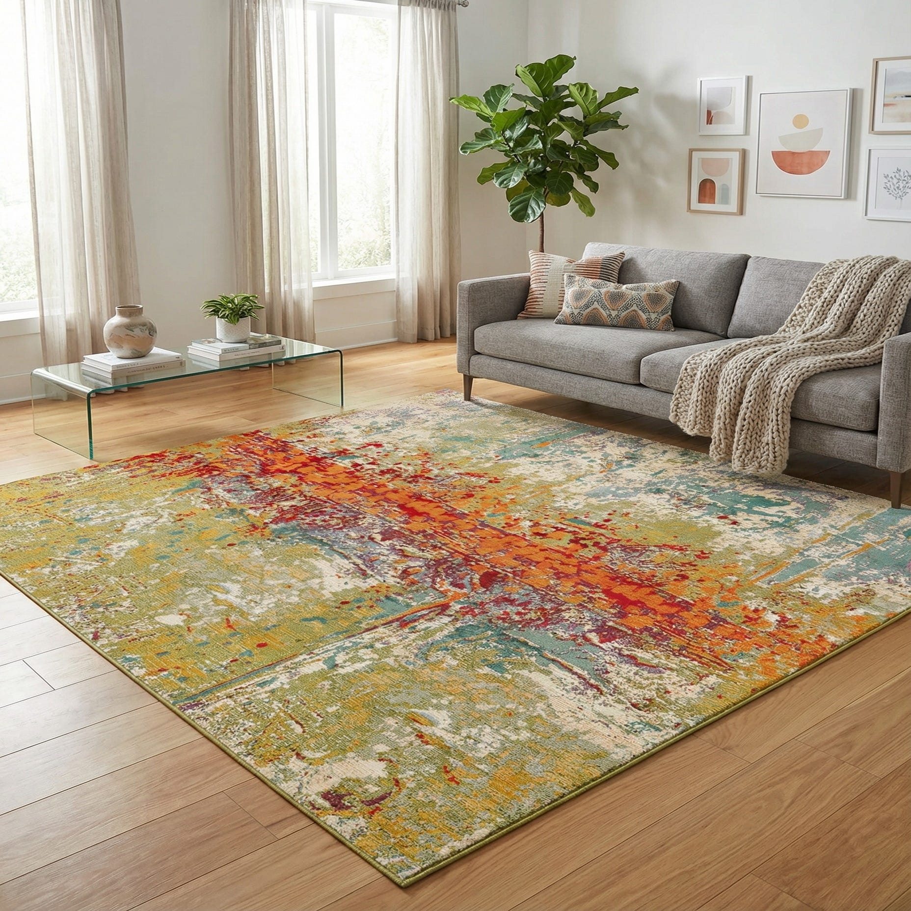 A layered, painterly abstraction in a multi background, this rug combines splashes of orange and red with cooler notes of blue, navy and green, all softened by fields of beige and gold. The pattern reads like a weathered canvas: a horizontal band of fiery color cuts across the middle while finer flecks and streaks create depth above and below, giving the surface an artful, lived-in appearance. The overall effect is modern and expressive without strict symmetry, making the rug a strong visual anchor for a variety of settings.