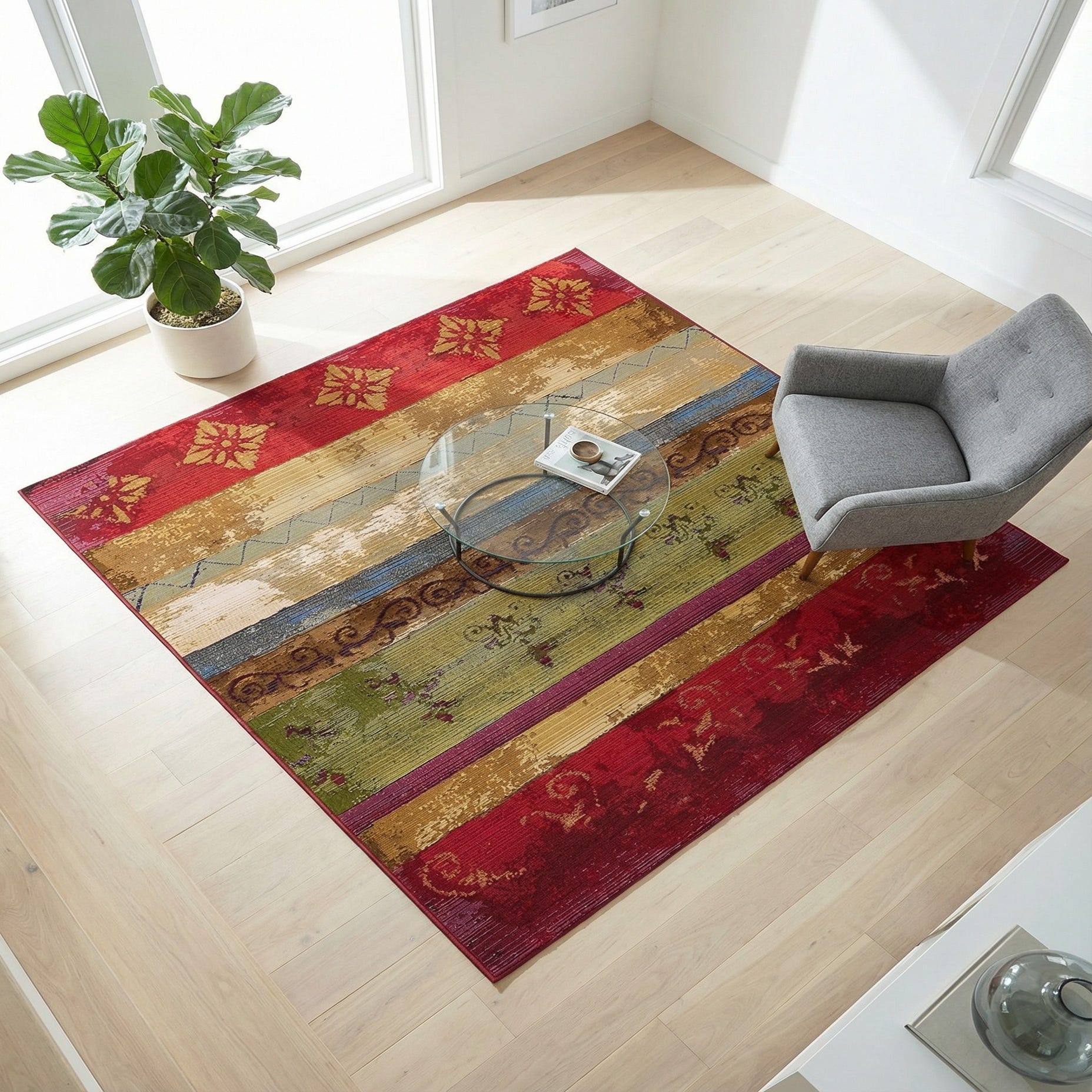 The tightly woven construction produces a low, slightly ribbed surface that feels firm underfoot while maintaining clear pattern definition. Its color palette and texture make it a versatile choice for a covered patio or sunroom, where it can anchor a dining or seating area; layered in an entryway to introduce color and interest against wood floors; or placed beneath a small conversation set or bistro table to bring warmth and pattern to outdoor-adjacent spaces. Pair with neutral upholstery and brass or gold accents to highlight the warm tones, or mix with natural woods and leafy plants to enhance the rug’s earthy greens and blues.