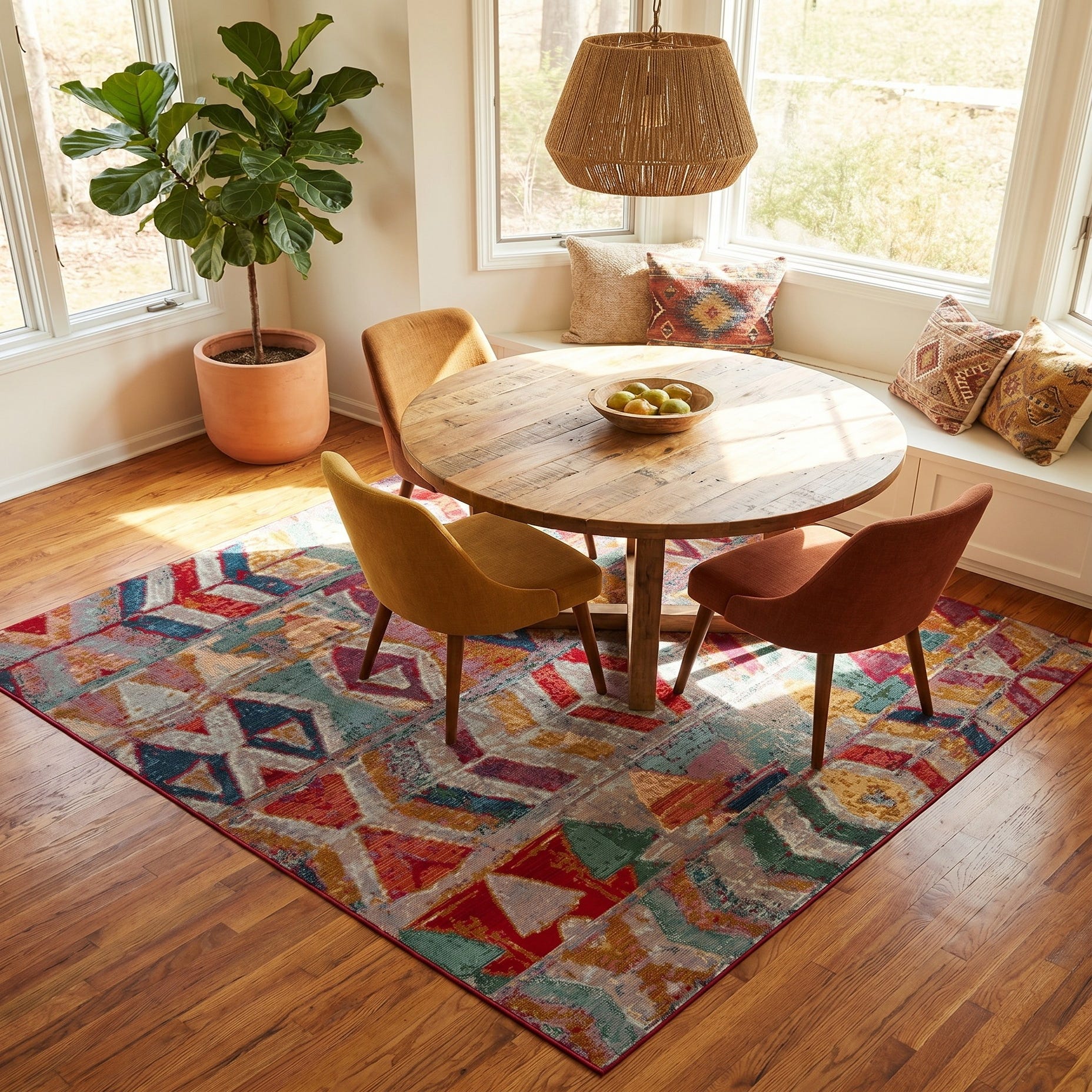 Fell in love with this rug when I saw it on-line for its delightful pattern and vivid colors. It arrived in two days from the day ordered about a week ago. We put it down on our renovated deck today...it is even more awesome than we thought it would be! The colors and pattern outset the colors of the deck perfectly.