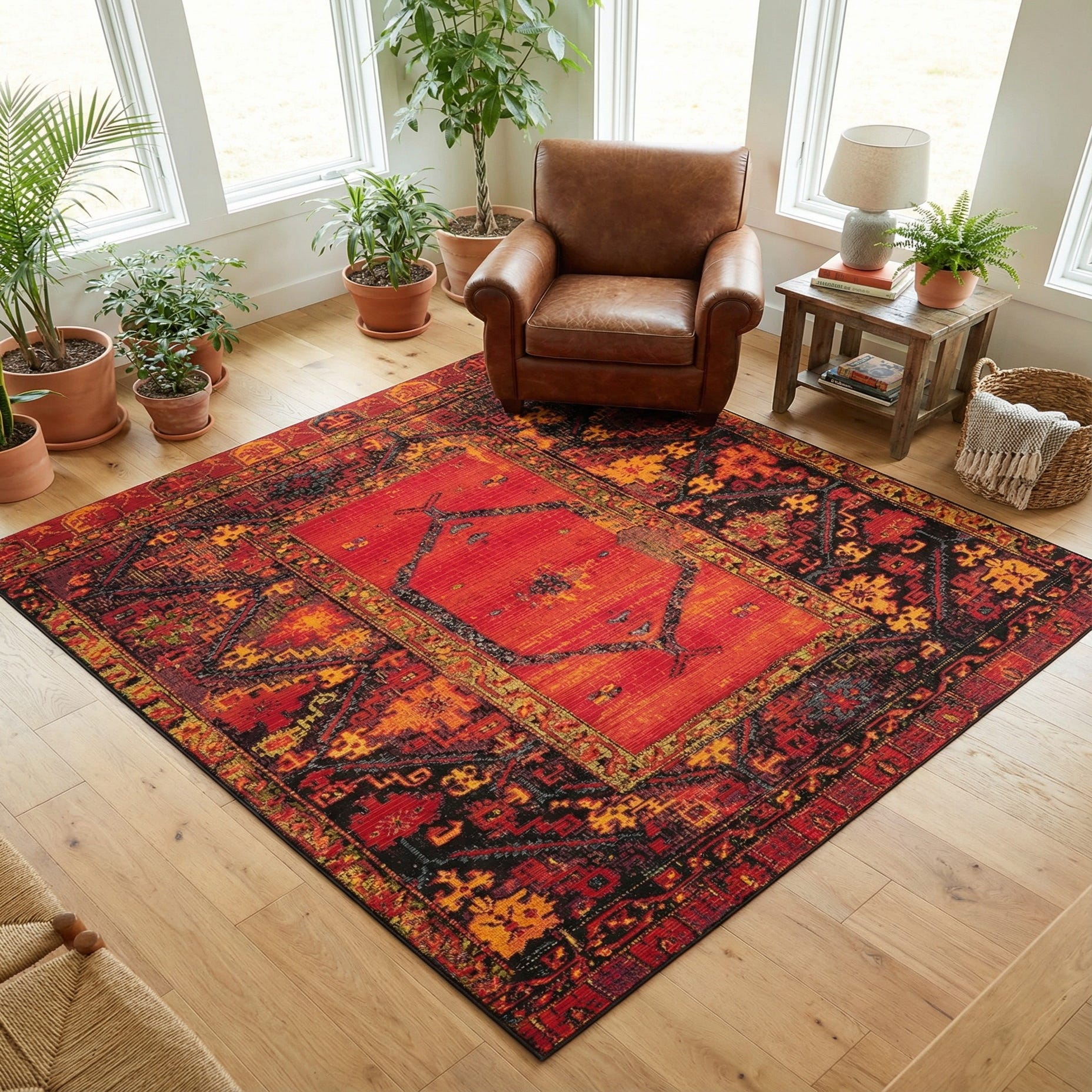 This rug fits a range of settings: place it beneath a leather sofa or warm wood coffee table in a living room for a grounded, collected feel; layer it on a covered patio or sunroom to introduce pattern without overwhelming the space; or center it in an entry or dining area to anchor furniture and add color. It pairs particularly well with neutral linens, industrial metal accents, or eclectic vintage pieces, providing a strong graphic foundation for both modern and globally inspired interiors.