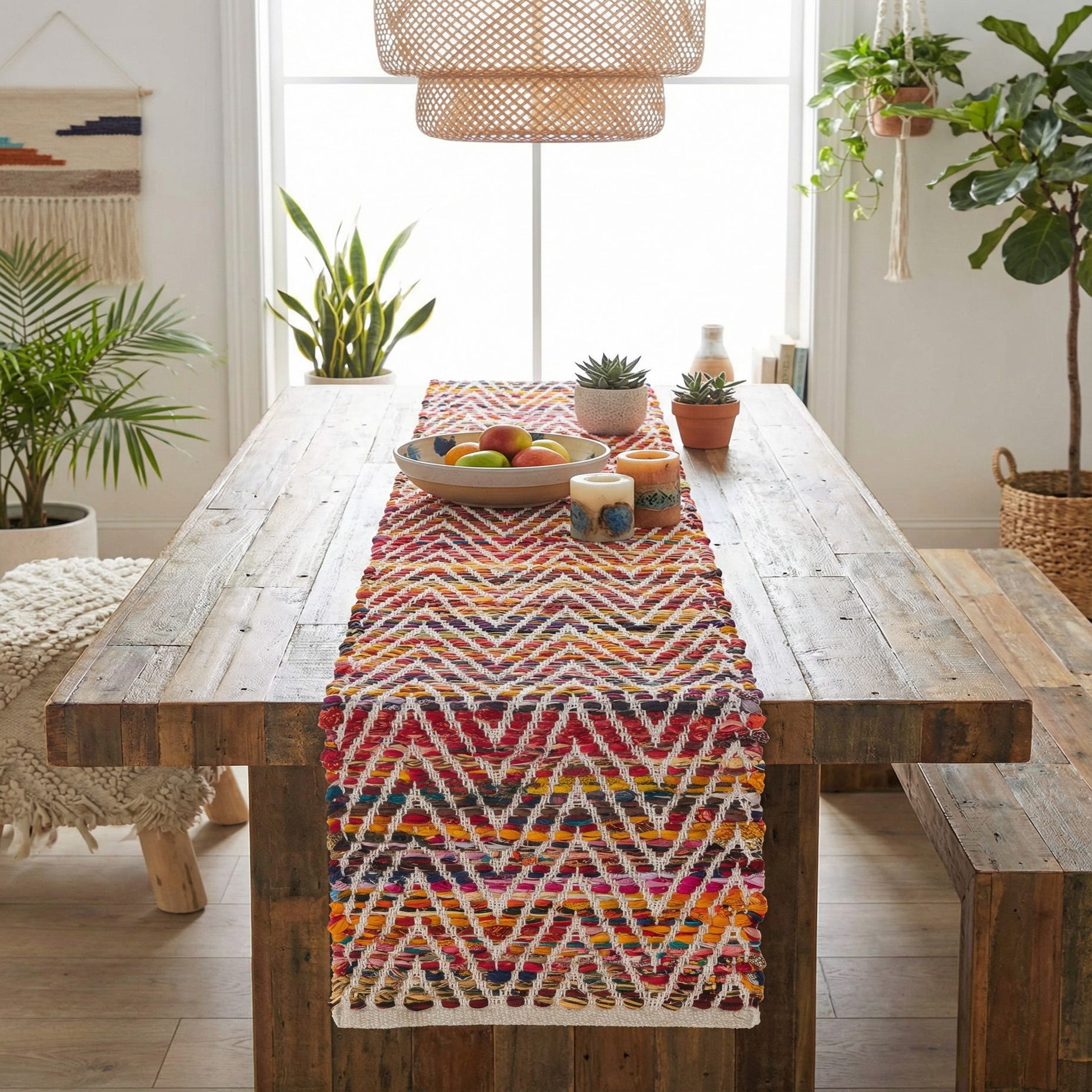 Hand-woven of 100% cotton, this table runner presents a lively chevron pattern formed from tightly braided cotton strips in a multi-colored background. Bands of black, navy, blue, gold, orange, red, yellow and pink weave through the zigzag design, creating rhythmic color shifts and visible texture. The rag-style weave gives the piece a gently slubby, tactile surface—soft to the touch yet structured enough to hold its shape on a tabletop.