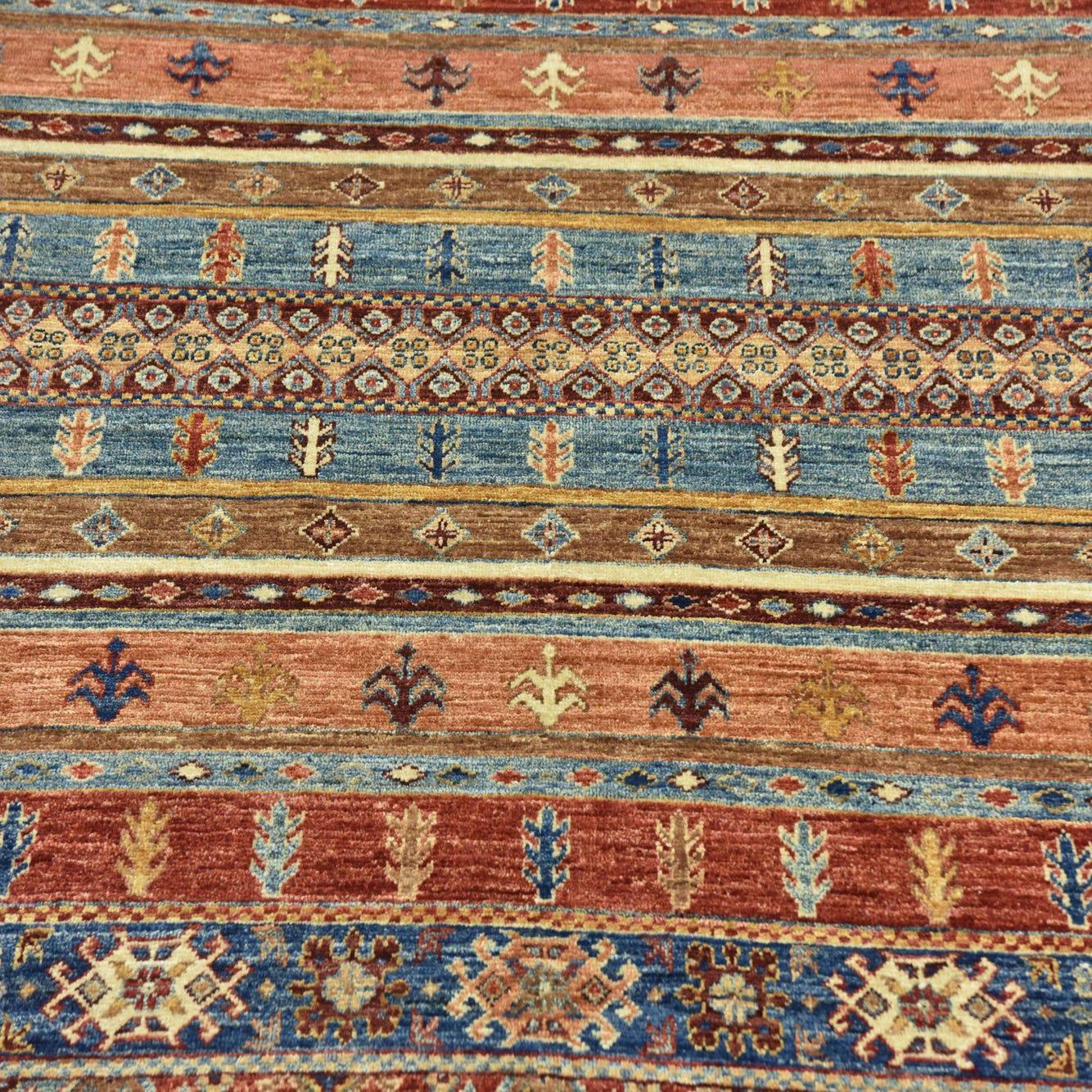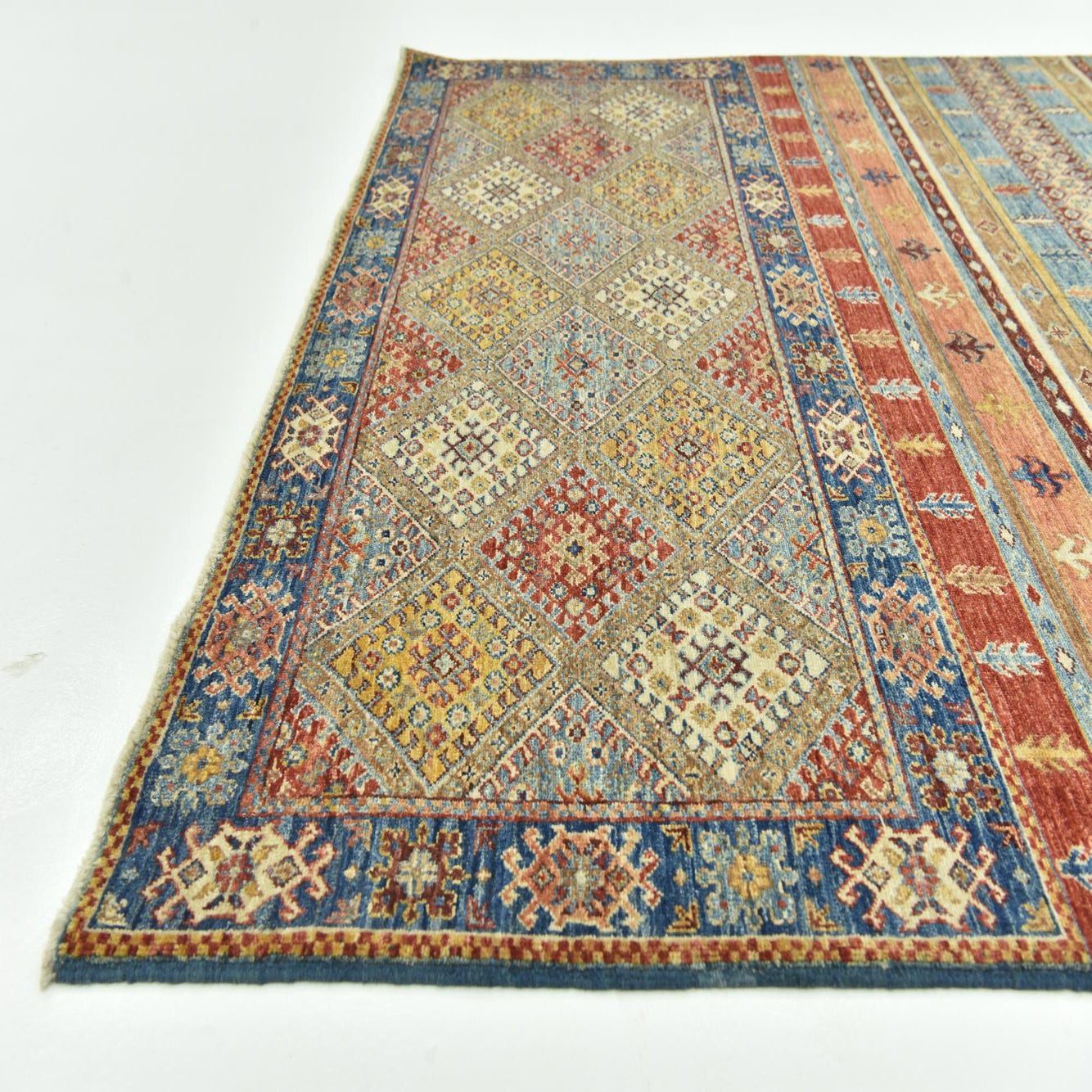 A rectangular 6x9 multi-colored Ariana Ziegler rug featuring traditional Oriental stripes and diamond patterns, ideal for a living room.
