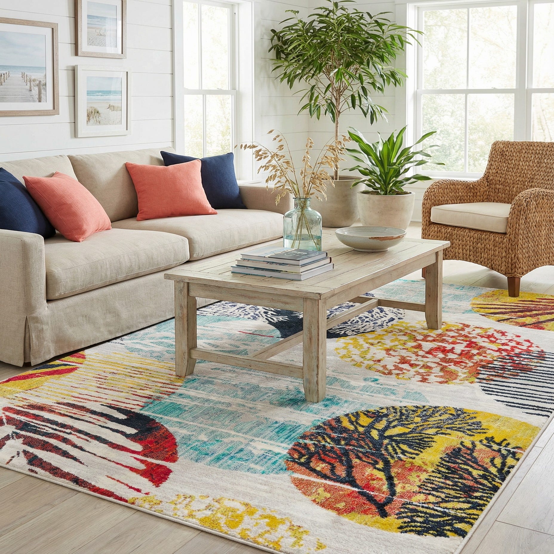 This rug works well as a focal layer in contemporary living rooms, a spirited anchor for a sunroom or family space, or under a round dining table to introduce pattern without overwhelming the layout. It complements coastal, modern eclectic, and bohemian interiors, and its vibrant palette makes it easy to coordinate with neutral upholstery or colorful accent pieces. The synthetic fiber blend is appropriate for areas with regular use where you want color and pattern to enliven the room.