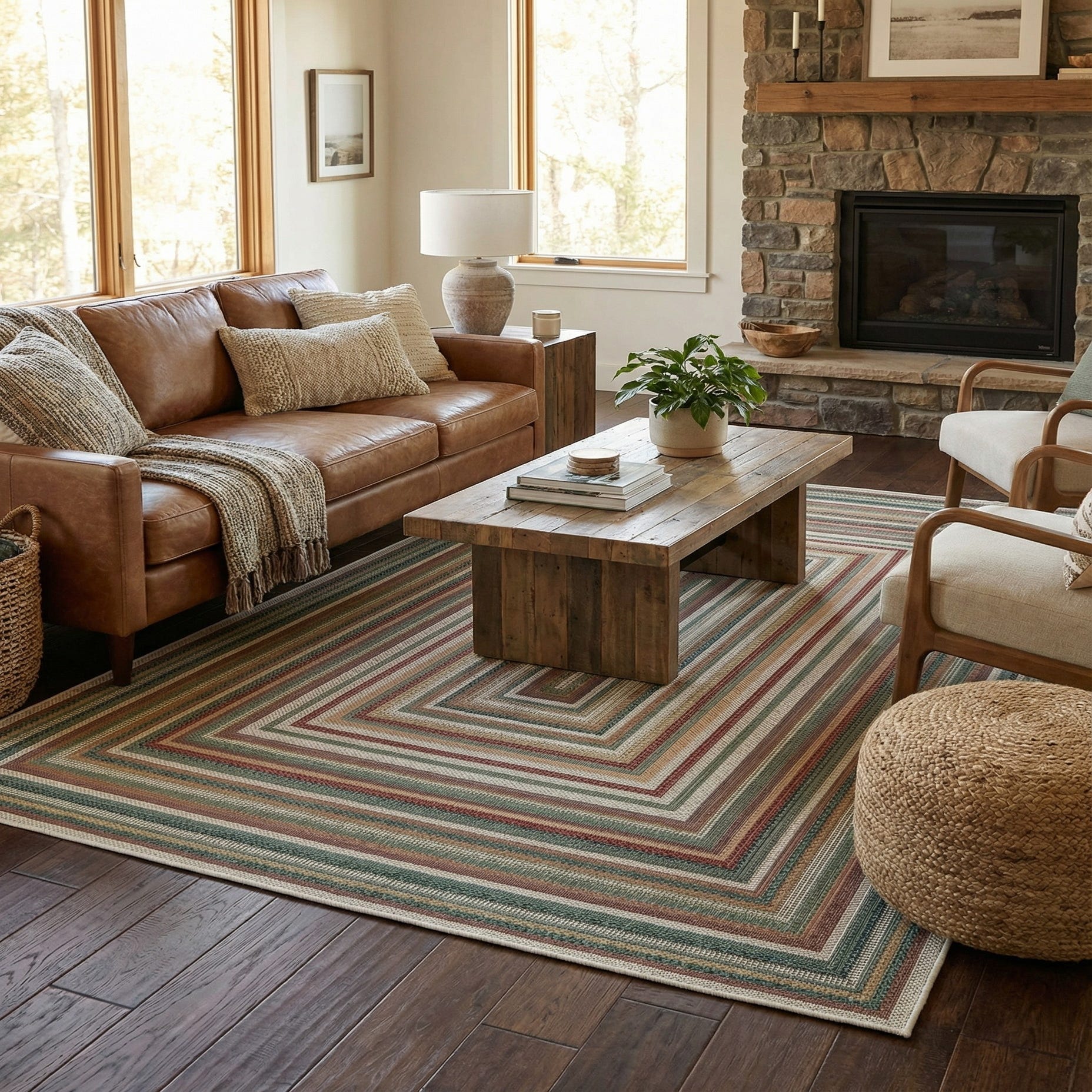 A 6x9 rectangular multi-colored rug featuring a concentric stripe pattern in shades of red, green, blue, and beige, suitable for indoor or outdoor use.