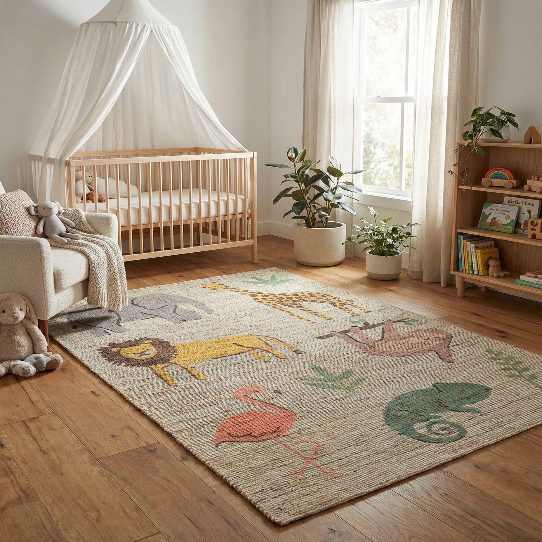 A 6x9 rectangular multi-colored Chenille & Jute rug featuring an elephant, giraffe, lion, sloth, flamingo, and chameleon on a natural background.