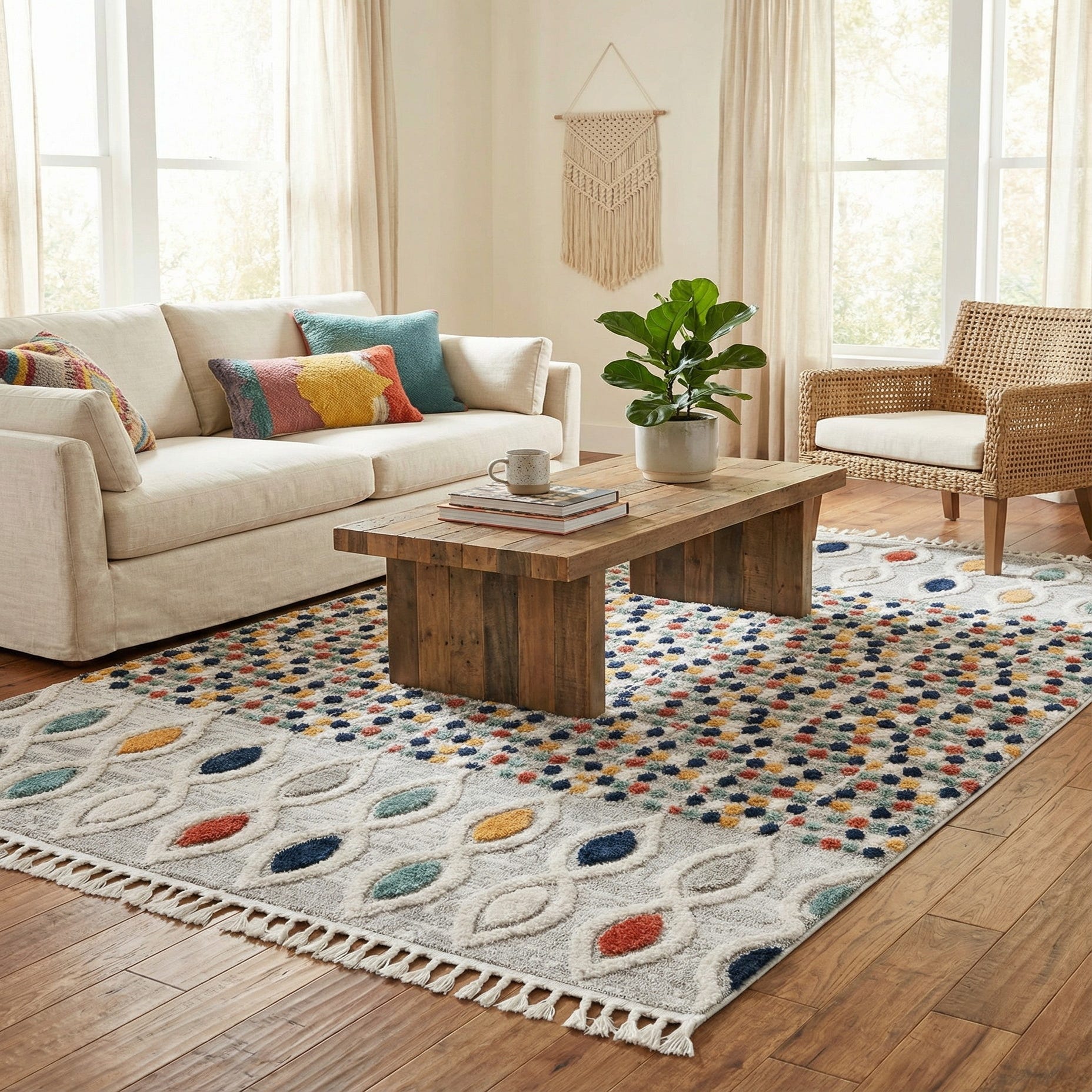 Machine made from 100% polypropylene, this rug has a low-to-medium pile with raised tufts in the dotted field and slightly higher, sculpted pile in the medallions for a tactile, dimensional feel underfoot. Its color palette and contemporary-but-relaxed pattern work well in casual living rooms, playrooms or family rooms, and it pairs nicely with mid-century or Scandinavian furnishings, natural wood tones and neutral upholstery. Use it to anchor a seating area, add color to an entry or layer it over hardwood for an instant style lift.