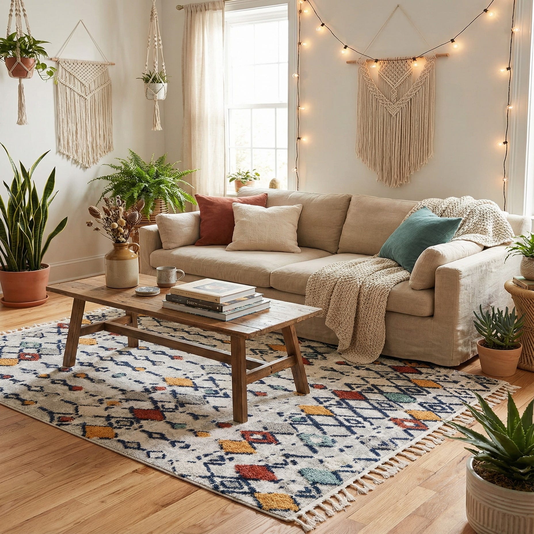 Machine made from 100% polypropylene, the pile is soft with subtly sculpted tufts that you can feel underfoot where the colored motifs rise from the field. It brings color and texture to a casual living room beneath a coffee table, anchors a layered bohemian bedroom, or brightens a family room with mixed wood and leather furnishings. The pattern also pairs well with neutral sofas and woven accents, and it complements eclectic, transitional, or mid-century modern schemes looking for a warm, patterned foundation.