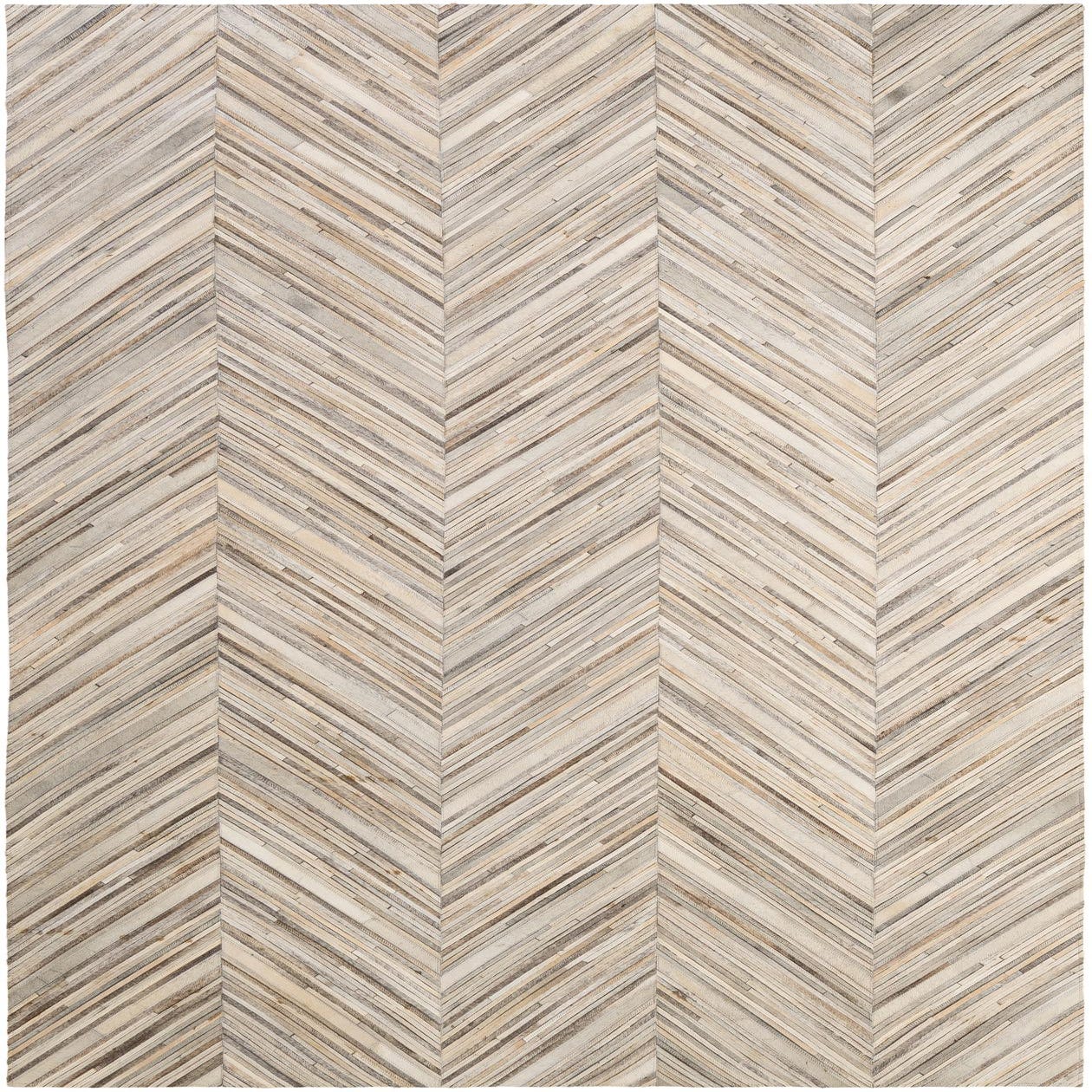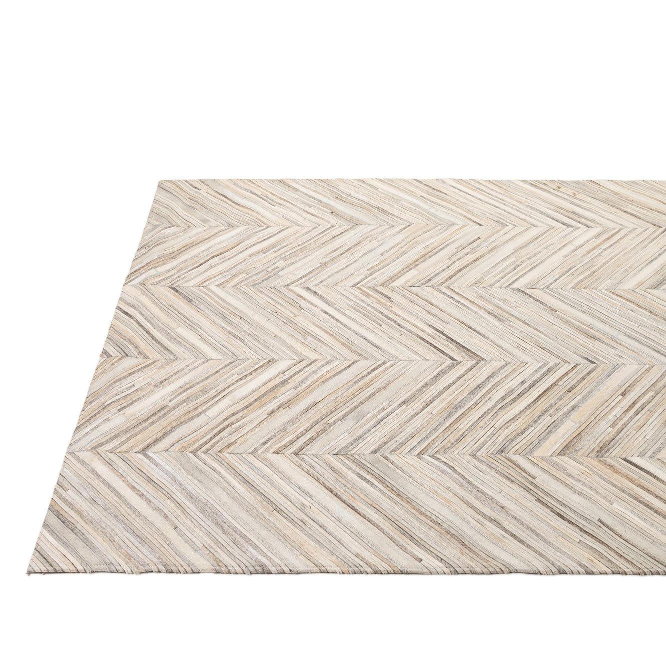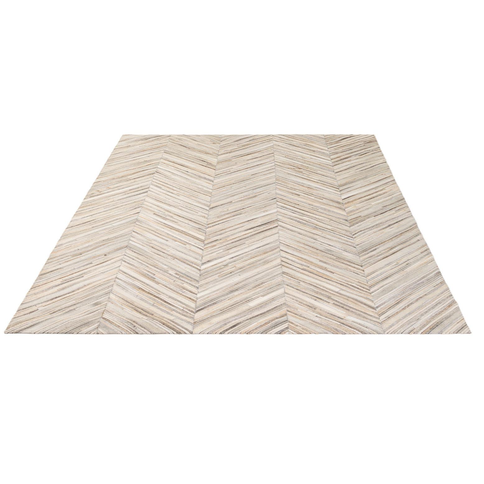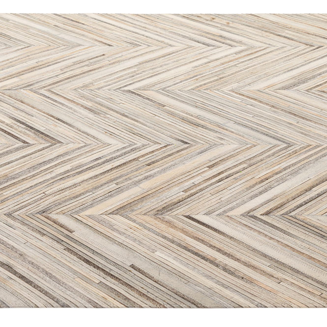 Narrow strips of hand-stitched cowhide are arranged in pronounced chevron columns for a clean, geometric pattern that carries across the rug. The multi background blends beige, gray, ivory, and light brown tones in subtle, natural variation, giving the surface a layered, linear look. Hand made of cowhide and leather, the rug has a low-profile, tactile surface where the natural grain and slight sheen of the hides are noticeable to the touch.