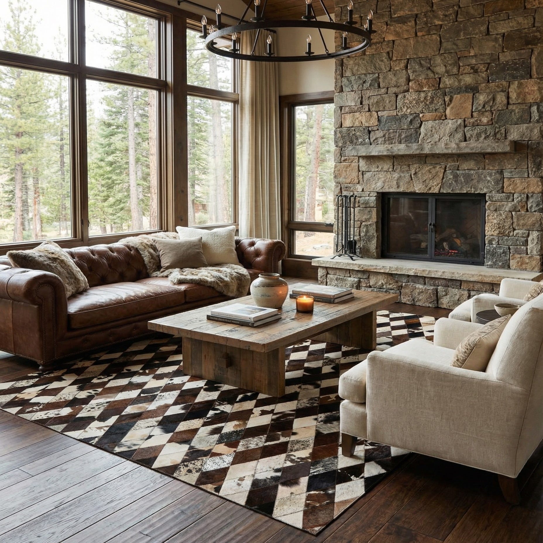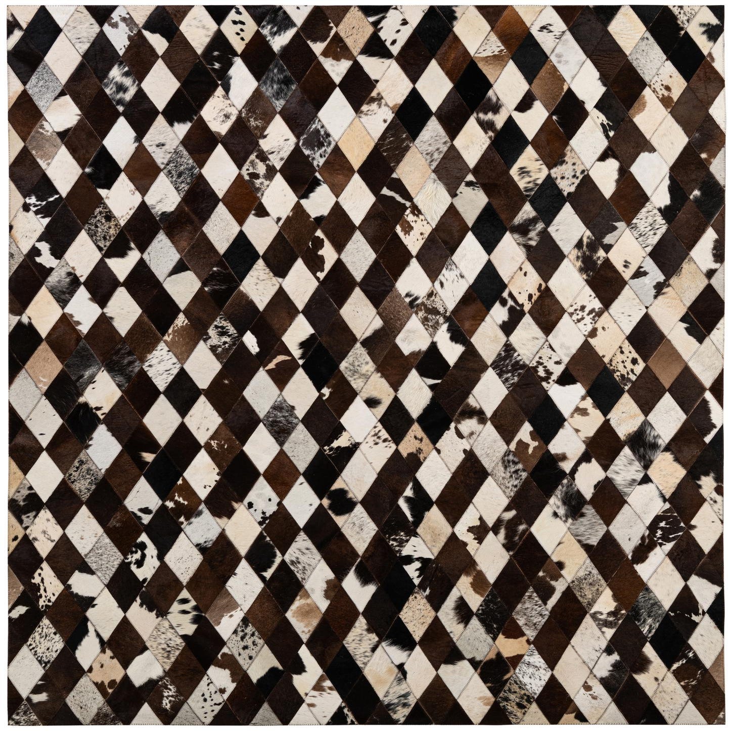 A 6x9 rectangular cowhide rug featuring a modern patchwork diamond pattern in shades of brown, black, and white.