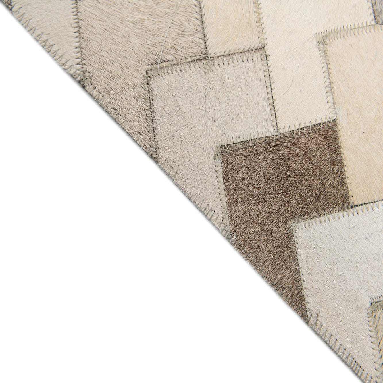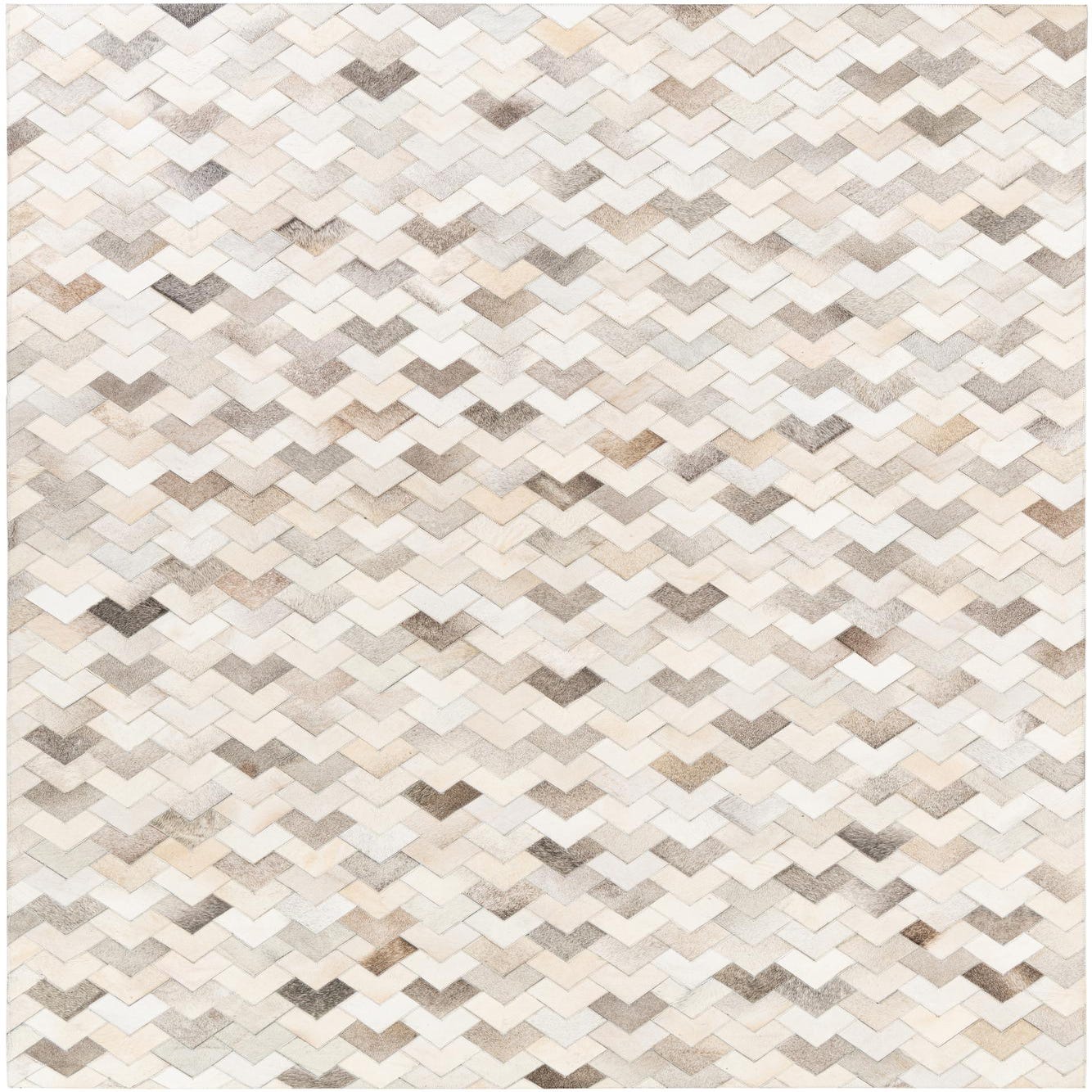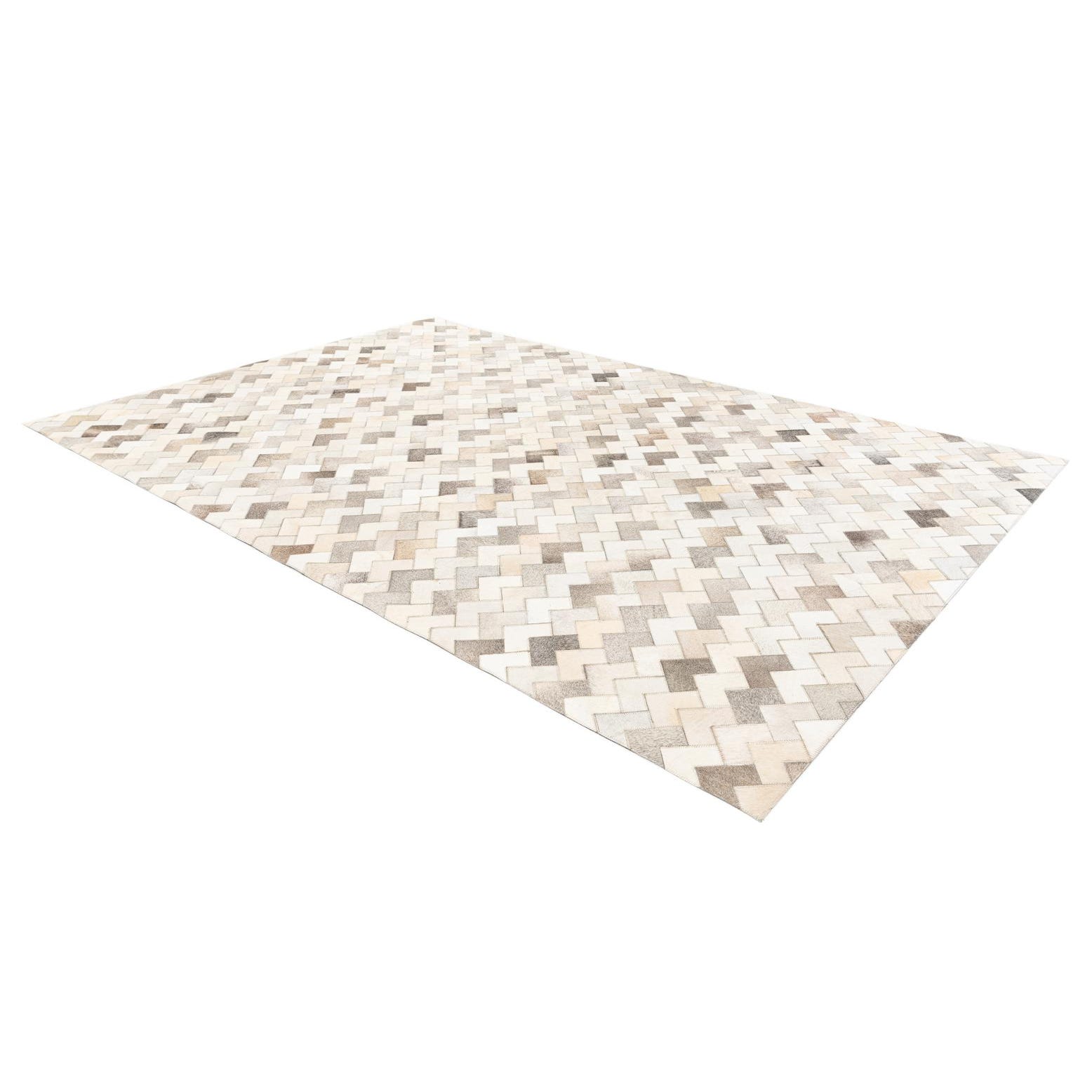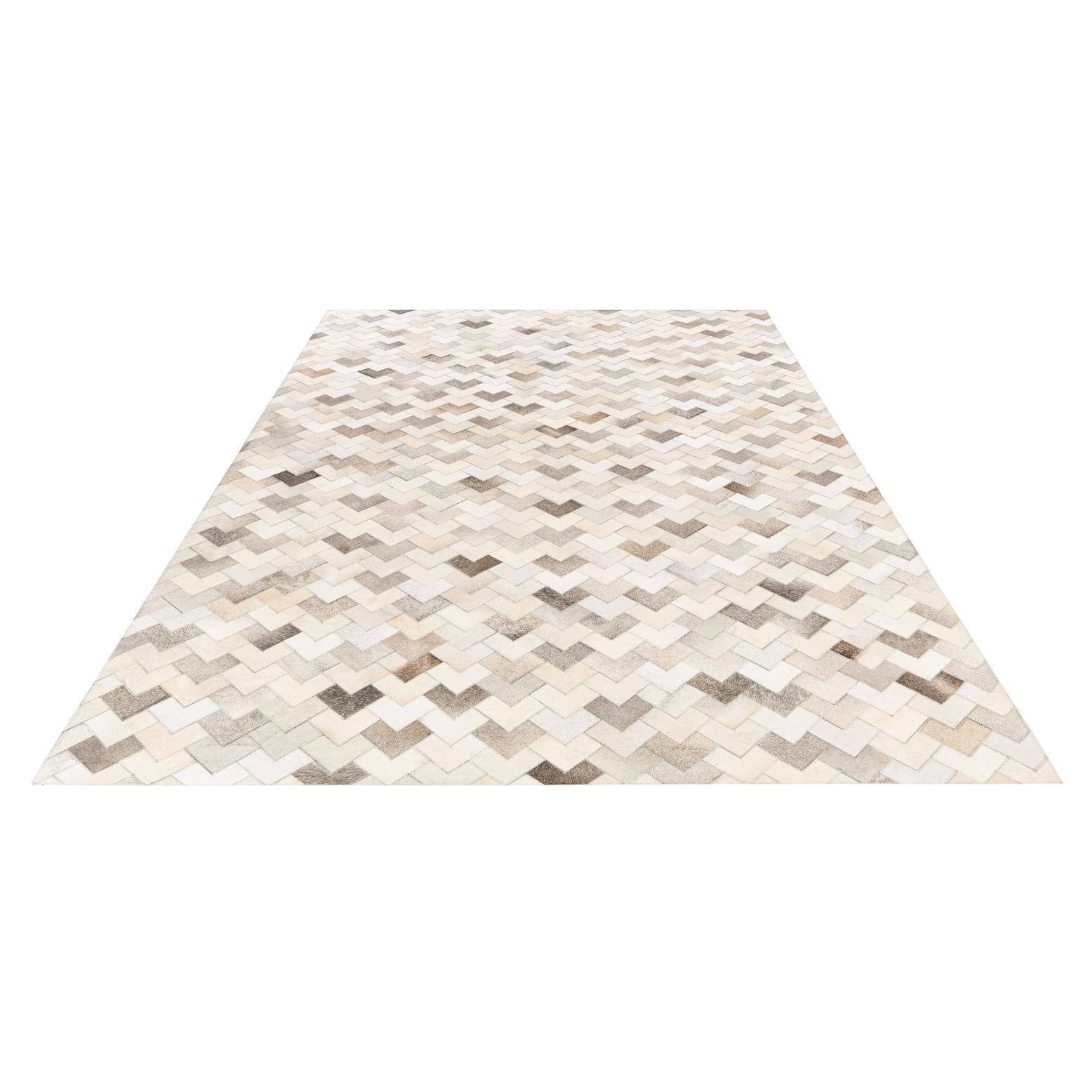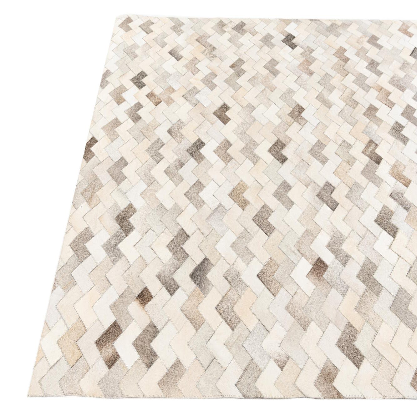 A 6x9 rectangular modern cowhide rug featuring a chevron pattern in various shades of cream, beige, and light brown.