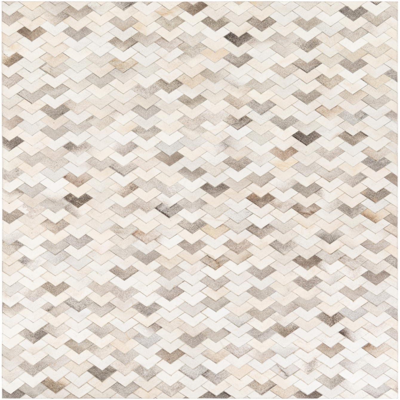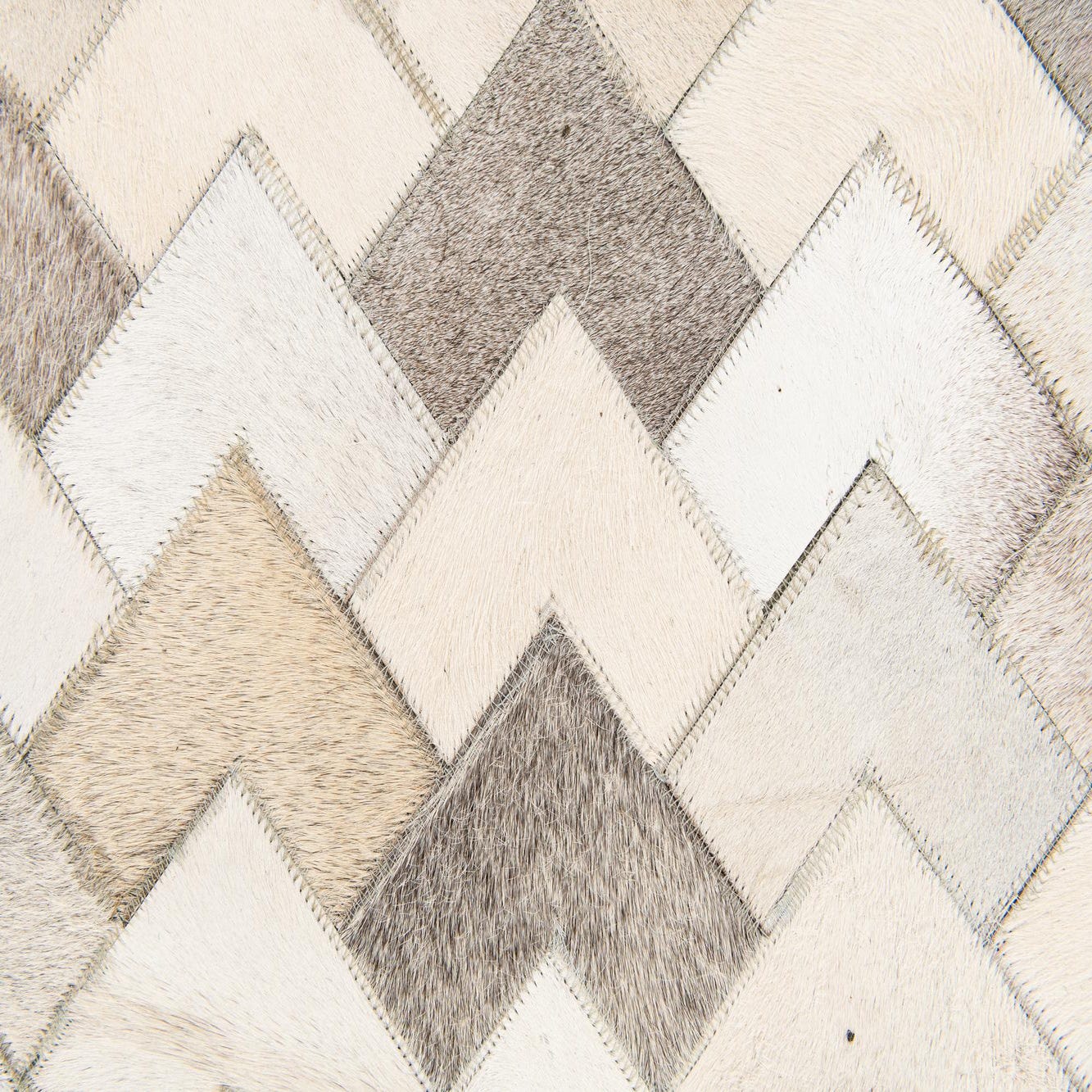A 6x9 rectangular modern cowhide rug with a chevron pattern in various shades of cream, beige, and light brown.