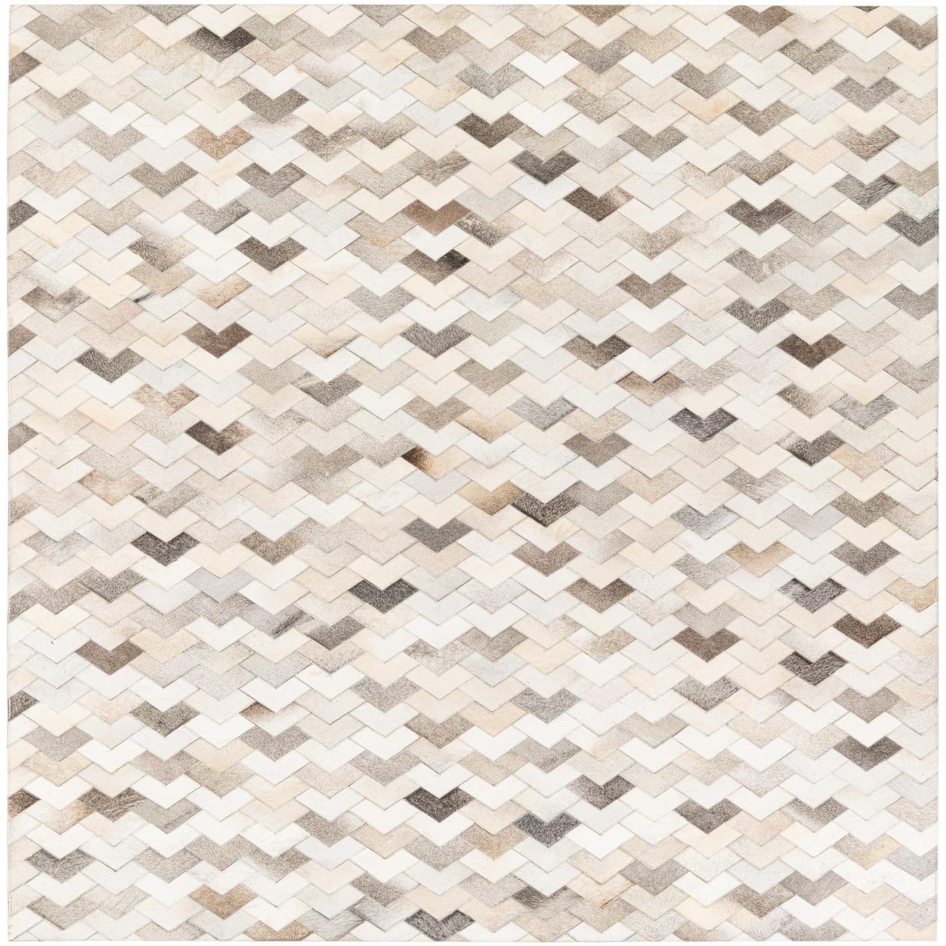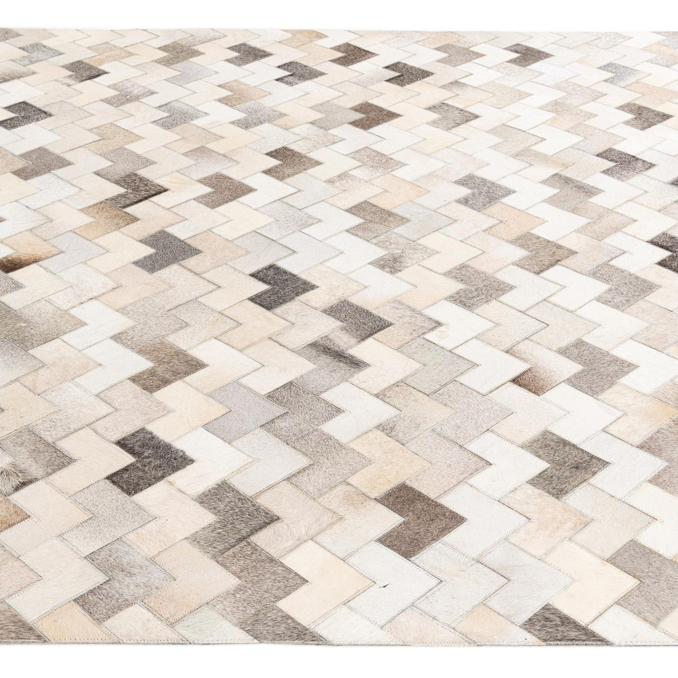 A 6x9 rectangular Cowhide Stocks rug featuring a modern chevron pattern in multi-colored natural cowhide and leather.