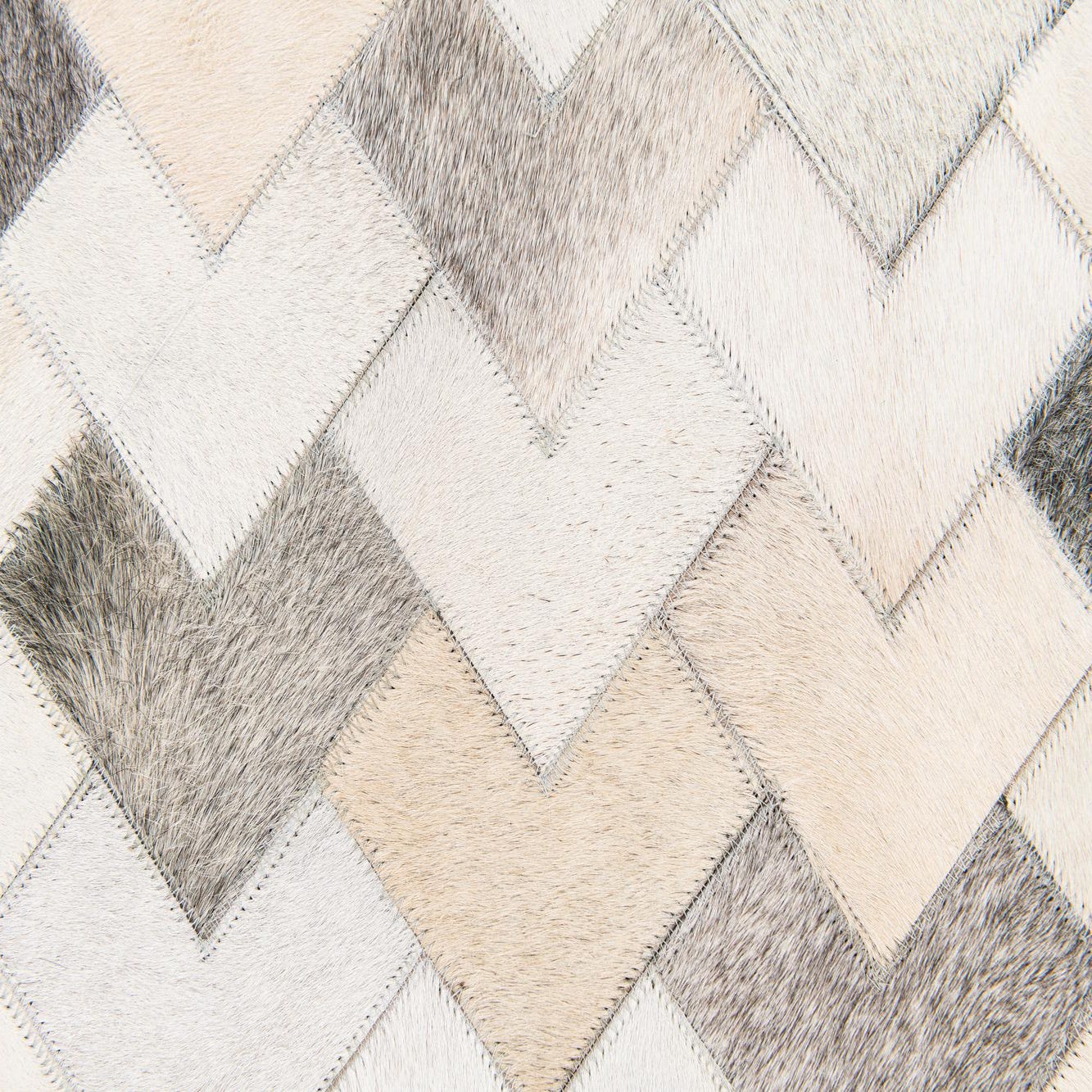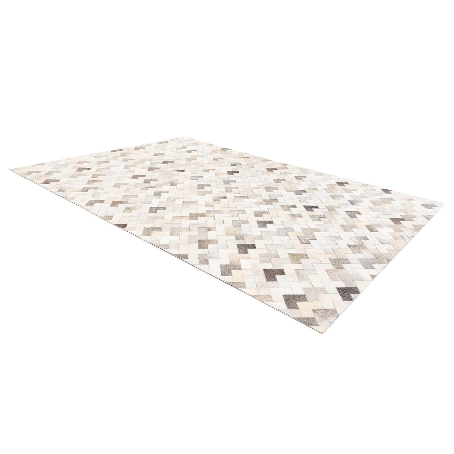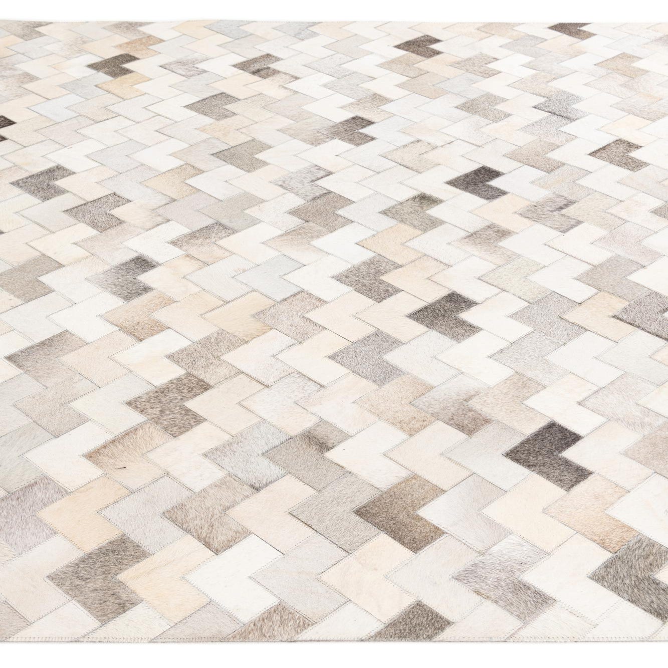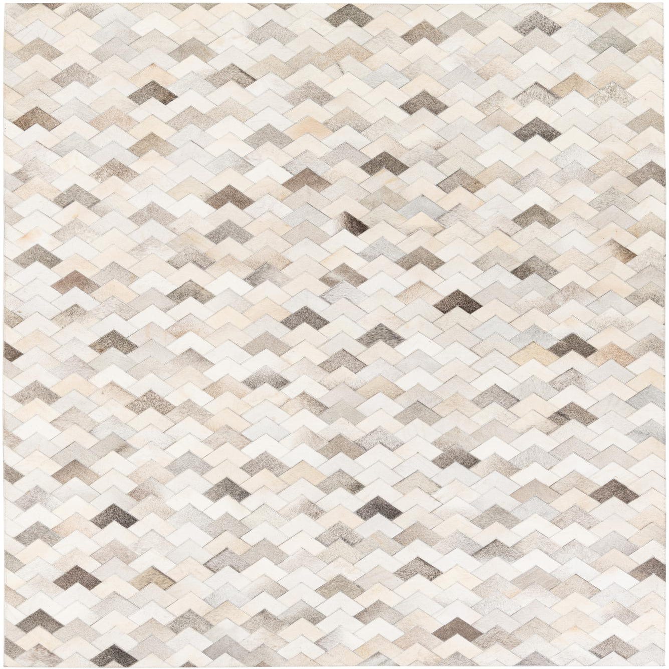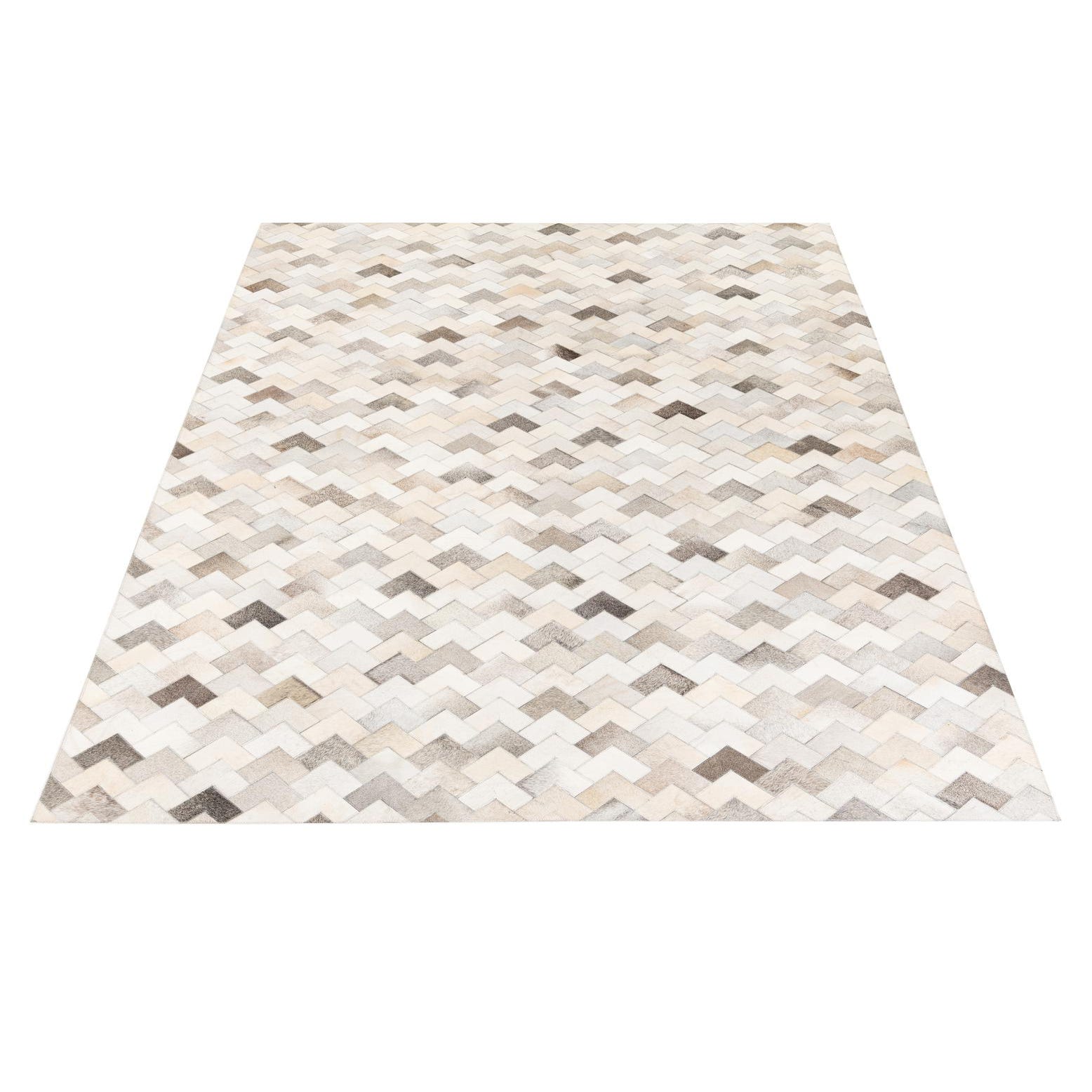 A 6x9 rectangular multi-colored cowhide rug with a modern chevron pattern in various shades of brown, beige, and white.
