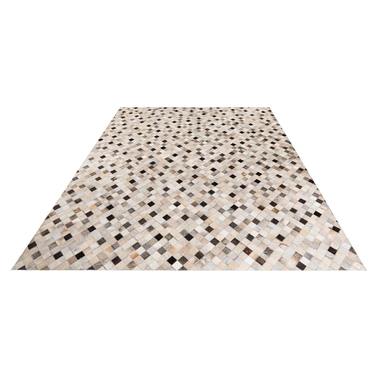 A rectangular 6x9 patchwork cowhide rug with a geometric pattern in various shades of brown, beige, and black.