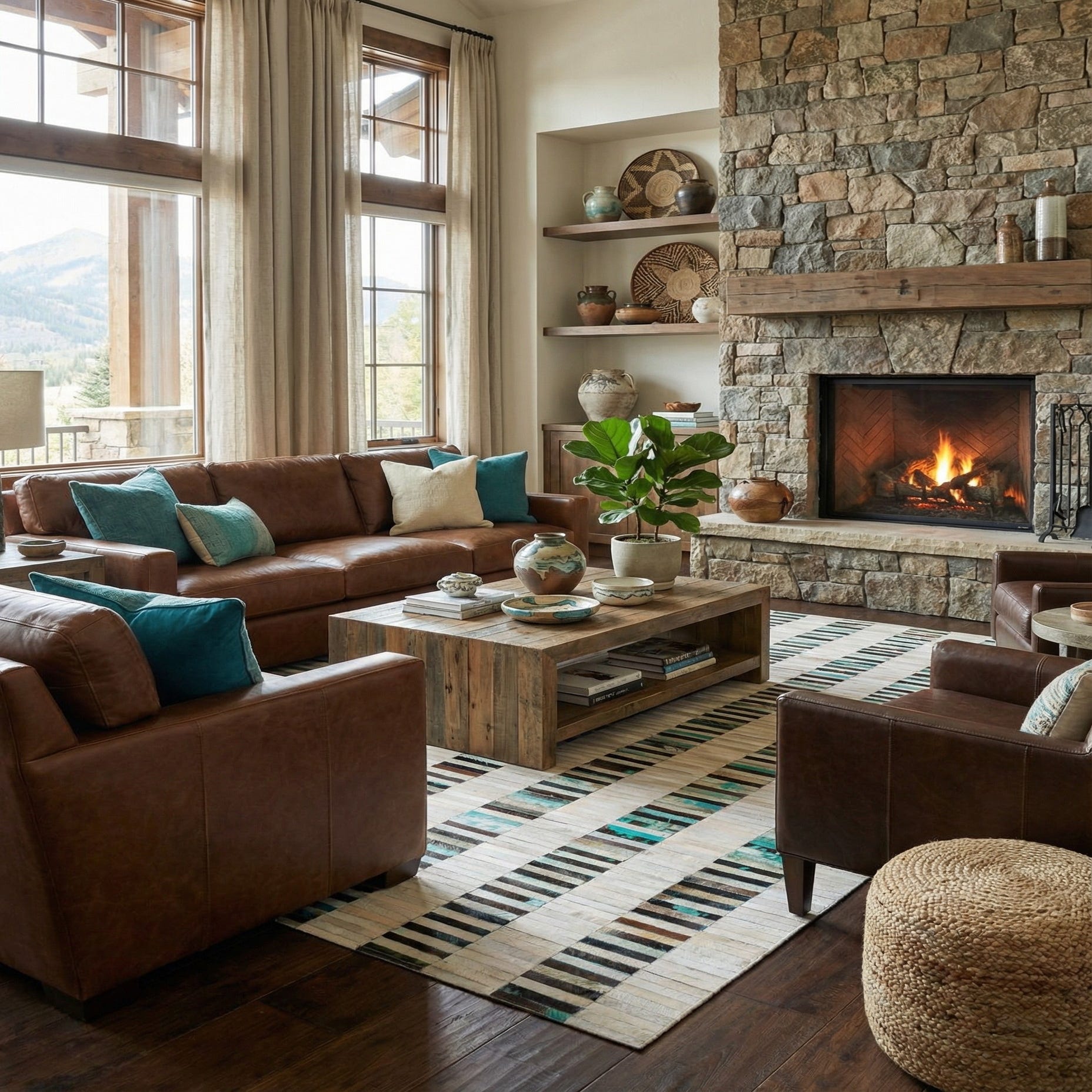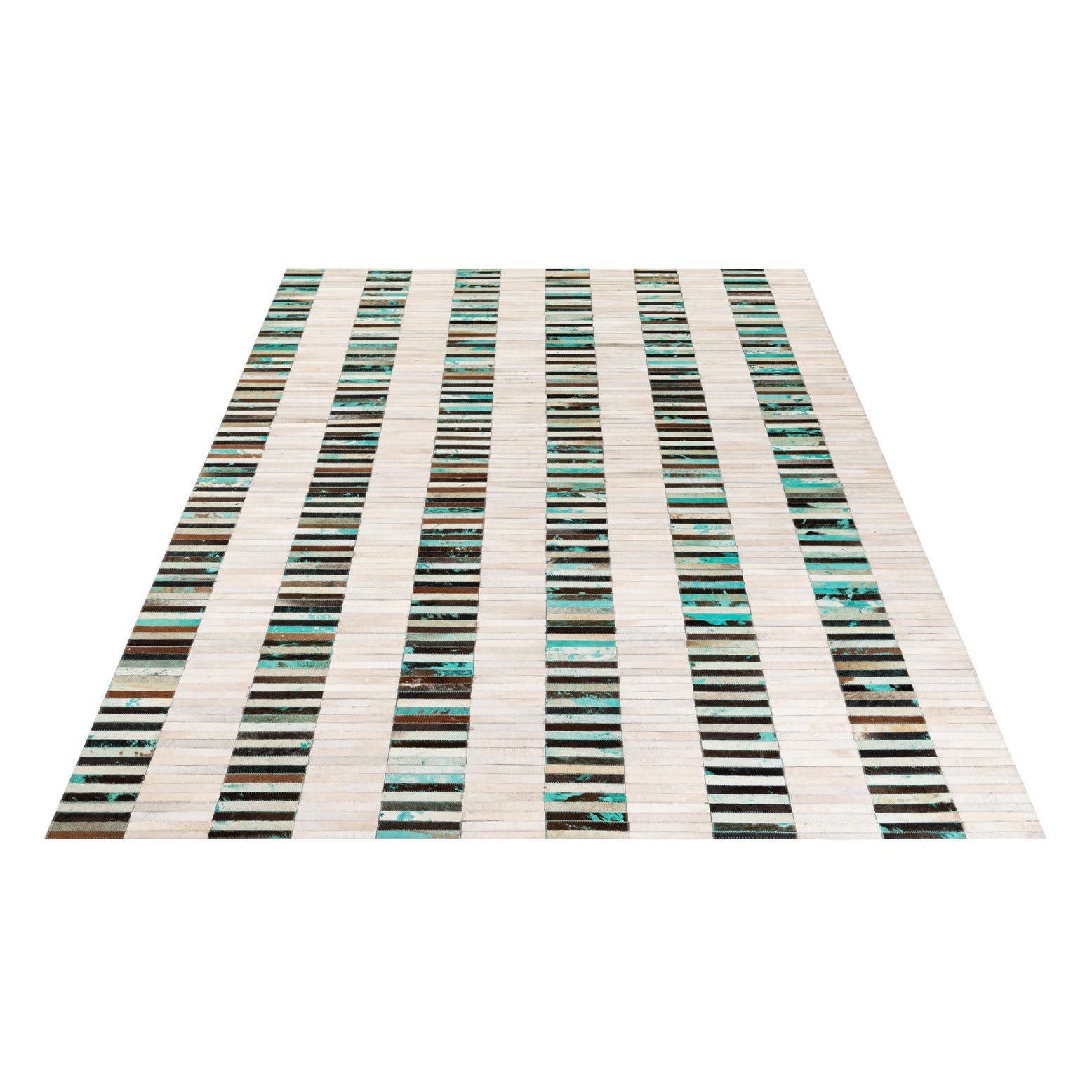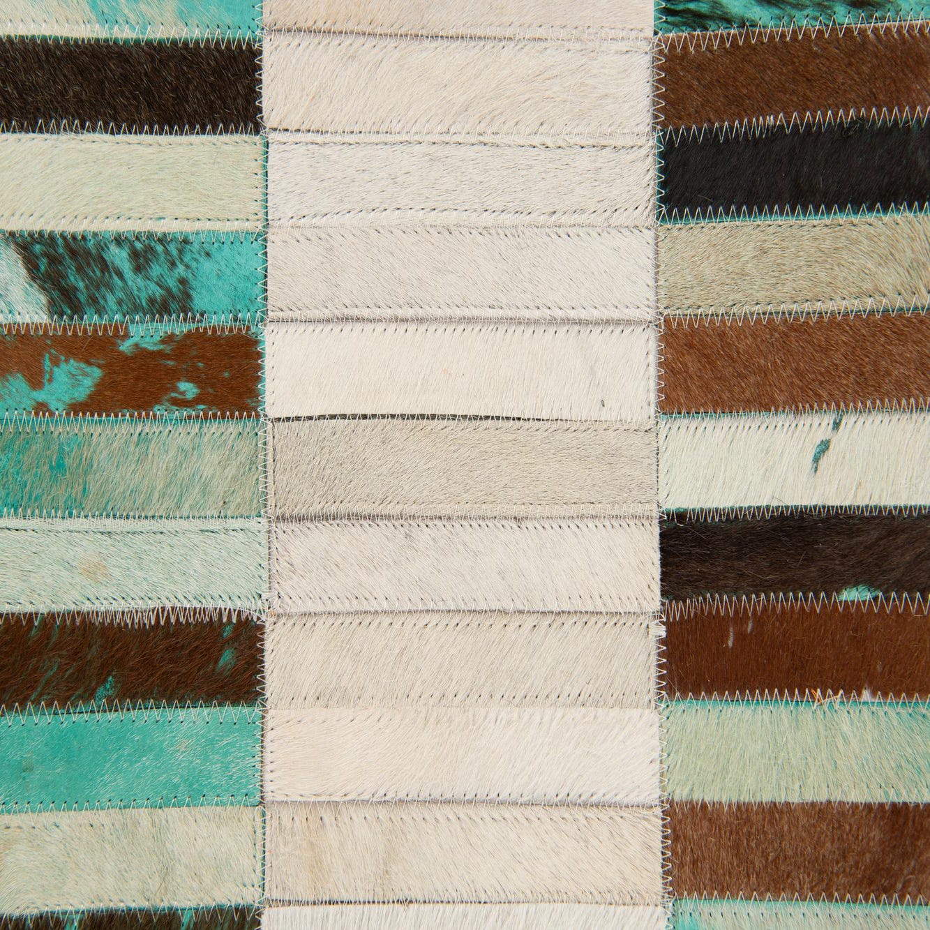 A 6x9 rectangular patchwork cowhide rug featuring vertical stripes of white, brown, black, and teal patches.