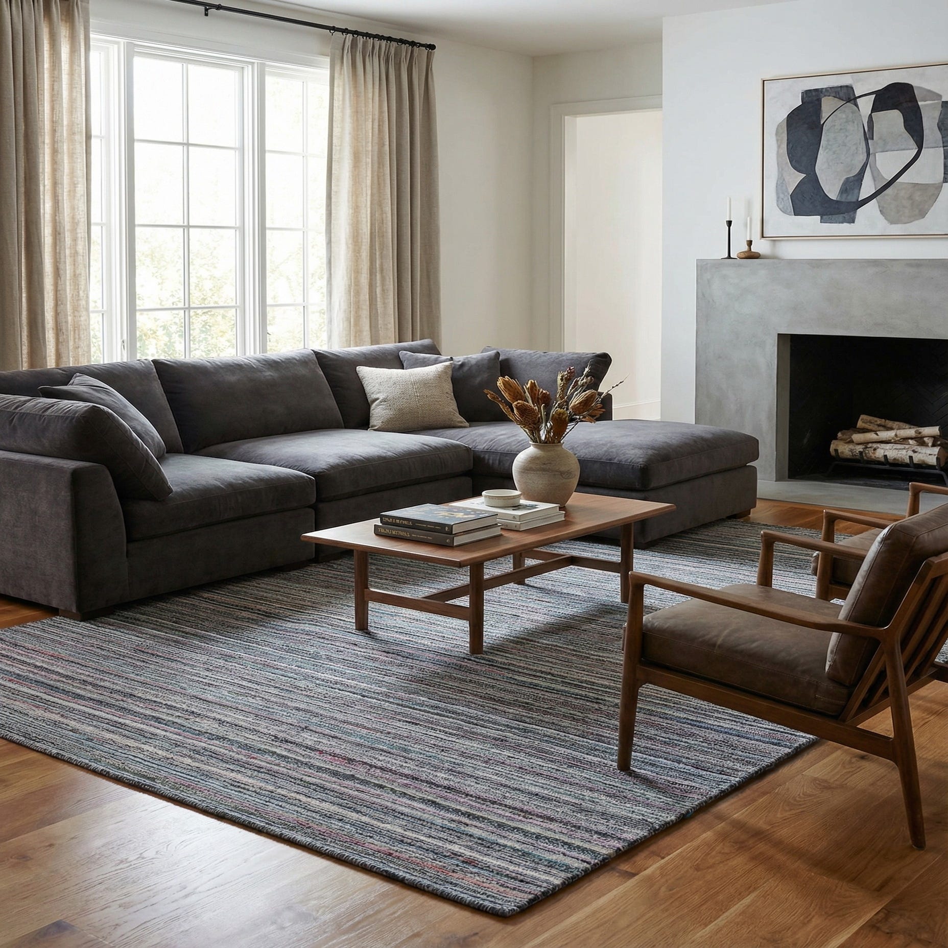 A 6x9 rectangular multi-colored wool area rug with a modern striped pattern, ideal for a living room or bedroom.