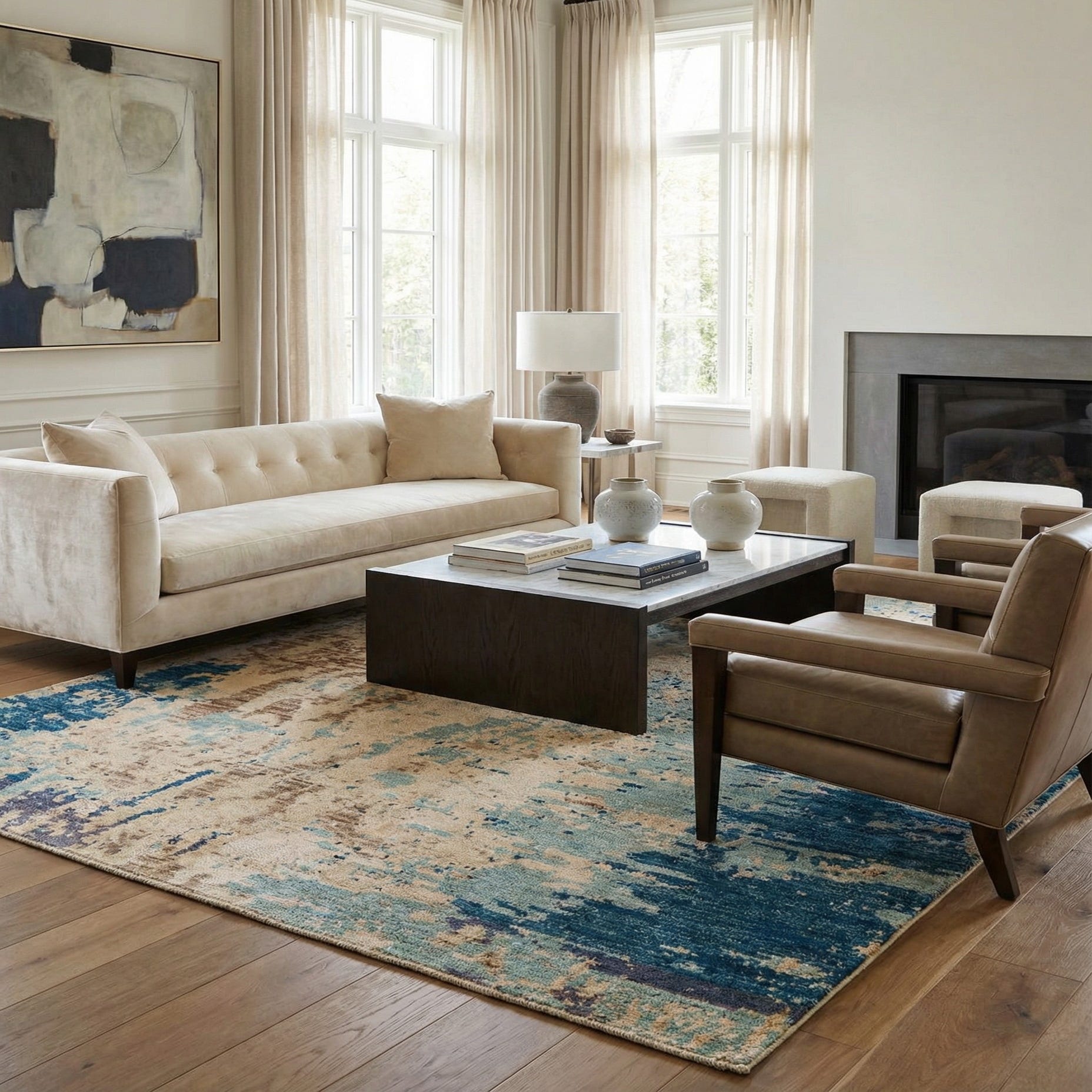 A 6x9 rectangular Darya rug with an abstract modern pattern in multi-colored tones of beige, brown, blue, and light blue.