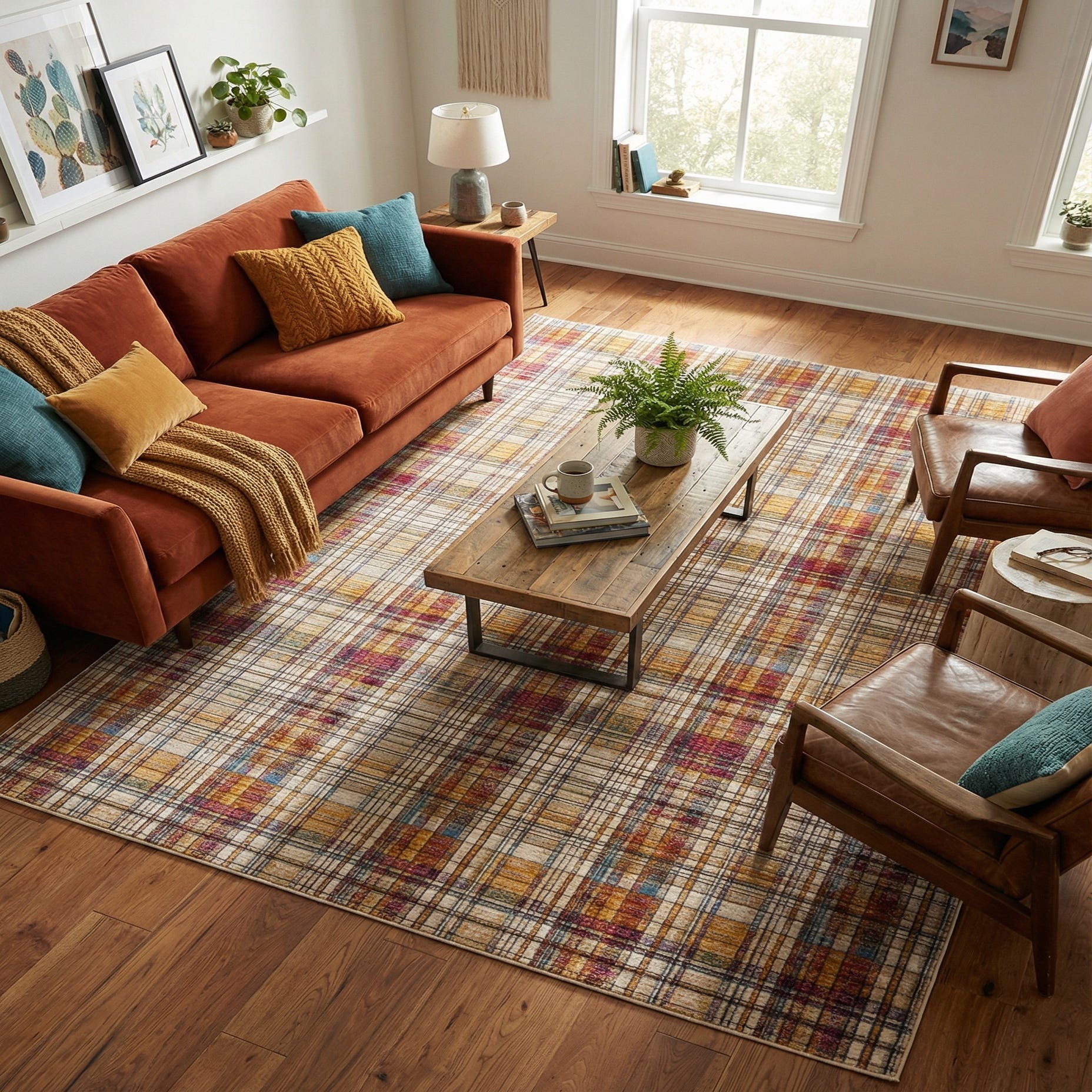 Machine-made from 100% polyester, the surface has a low, slightly brushed pile that feels smooth underfoot and shows the woven detail clearly. Place it to anchor a seating group in a contemporary living room, tuck it under a dining table in a transitional space, or use it to warm a home office—pair with warm wood tones, leather or neutral upholstery for balance, or layer with jewel-toned accents and matte metal finishes to highlight the stronger red and violet hues.