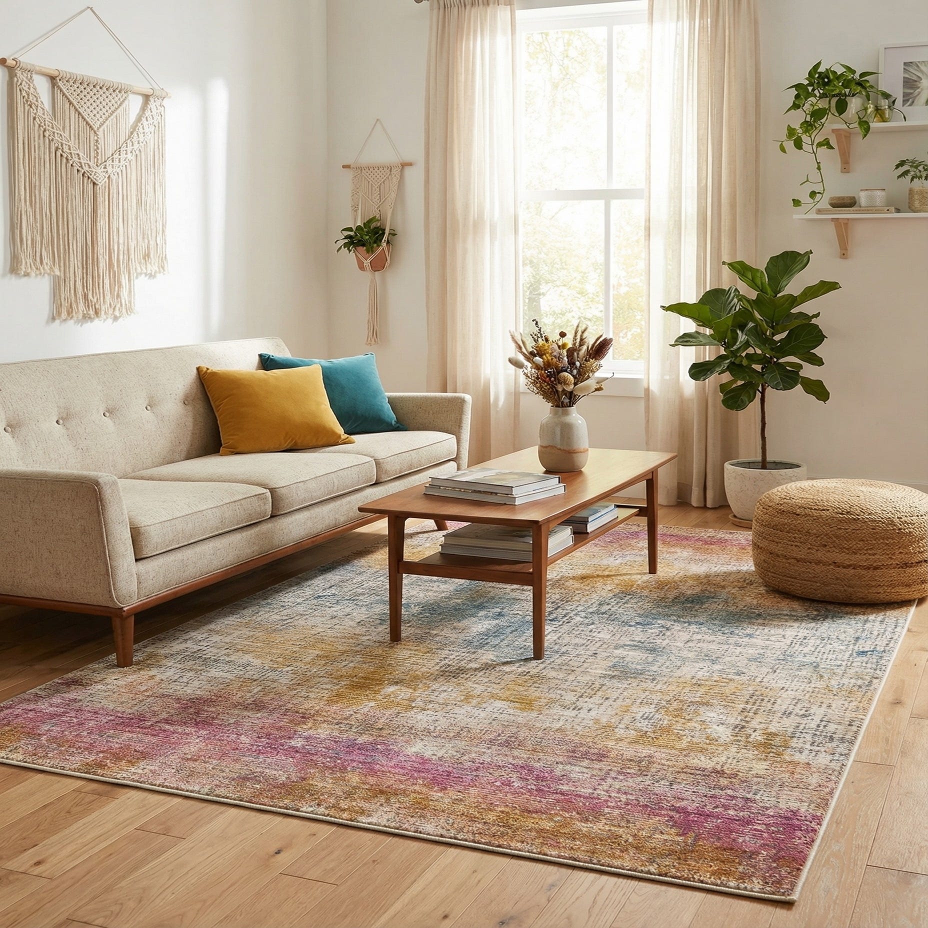 The versatile palette and contemporary-leaning pattern work well in a range of interiors. Place it to anchor a living area beneath a modern sofa and low coffee table, or layer it under a bed to add color without overpowering the room. It also pairs nicely with mid-century modern furnishings, eclectic boho decor, or a soft Scandinavian scheme where the pops of pink and blue bring a welcoming, lived-in warmth.