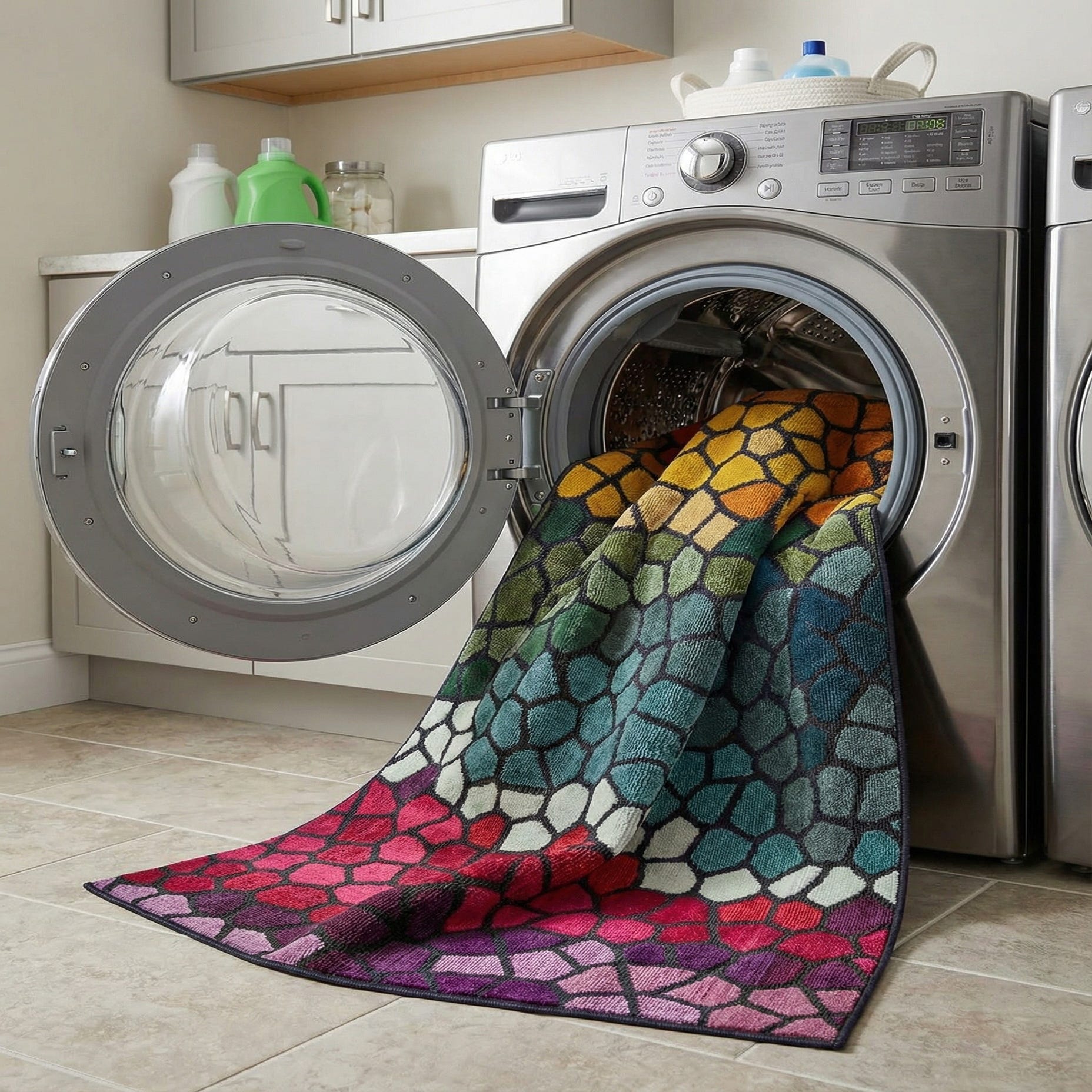 A 6x9 rectangular multi-colored rug with an abstract mosaic pattern, featuring vibrant shades of purple, red, teal, green, yellow, and orange.