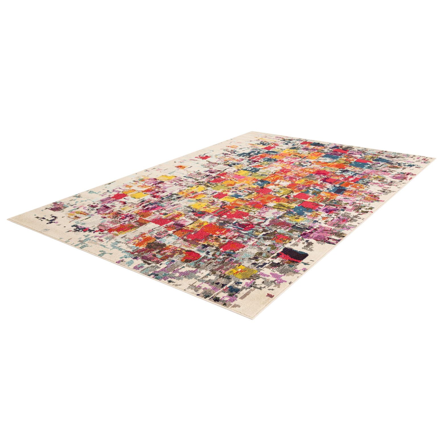 An energetic, abstract composition of painterly blocks and distressed flecks sits on a Multi background, creating a modern, art-inspired statement. Rich tones—beige, blue, burgundy, orange, purple, red, yellow, pink, green, light blue and navy—layer and overlap to form a pixelated mosaic that balances movement and color. Machine made from 100% polypropylene, the rug has a low-profile, slightly plush pile with a smooth, tightly tufted texture that invites you to run your hand across it and feel the soft, even surface and subtle low sheen.