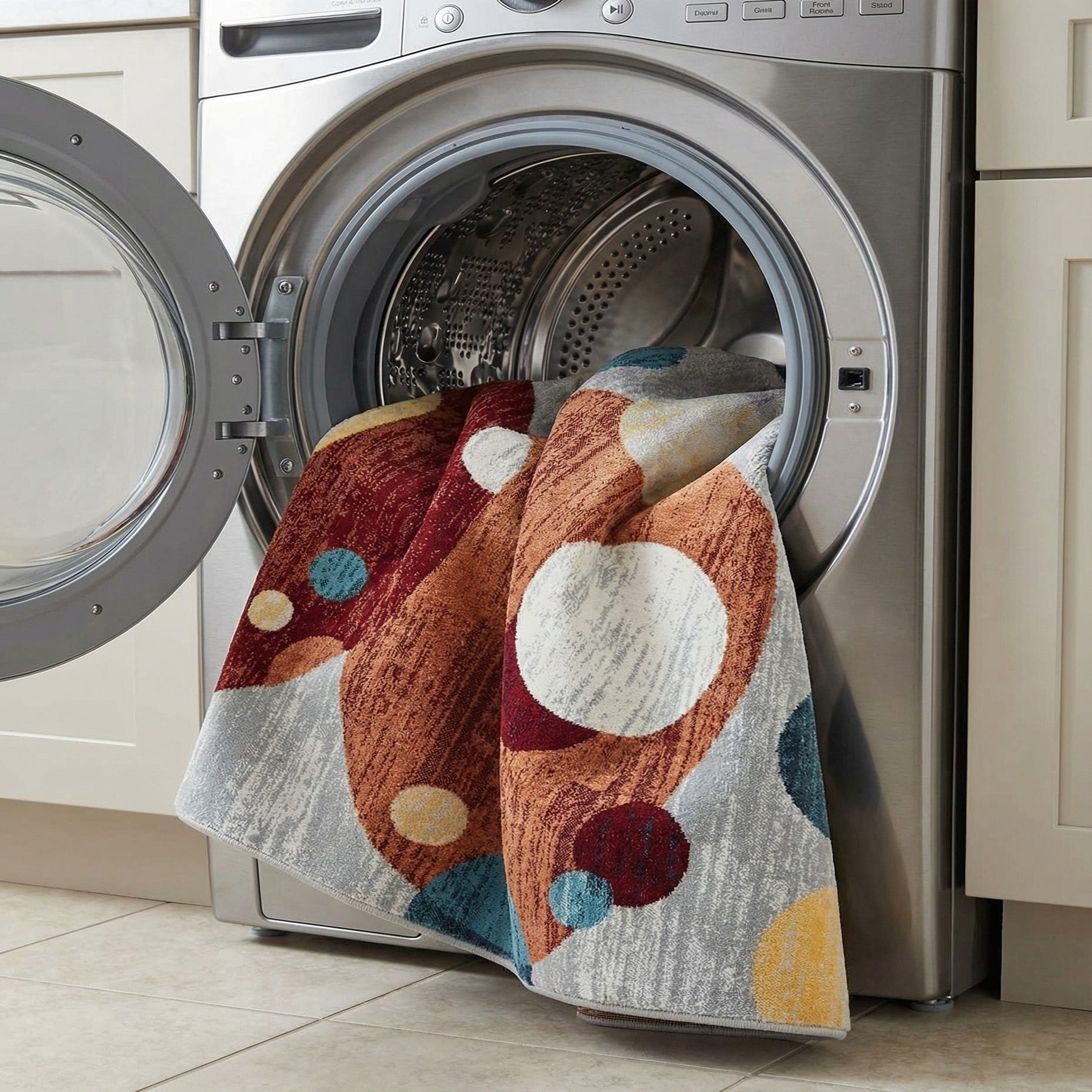 The Kamala Washable Collection offers a 6x9 rug that boasts a modern abstract pattern, characterized by an array of circles overlapping in a seemingly random fashion. The multifaceted color palette incorporates shades of beige, blue, ivory, gray, navy blue, red, and rust red, all set against a multi-hued background that can tie together a variety of interior color schemes.