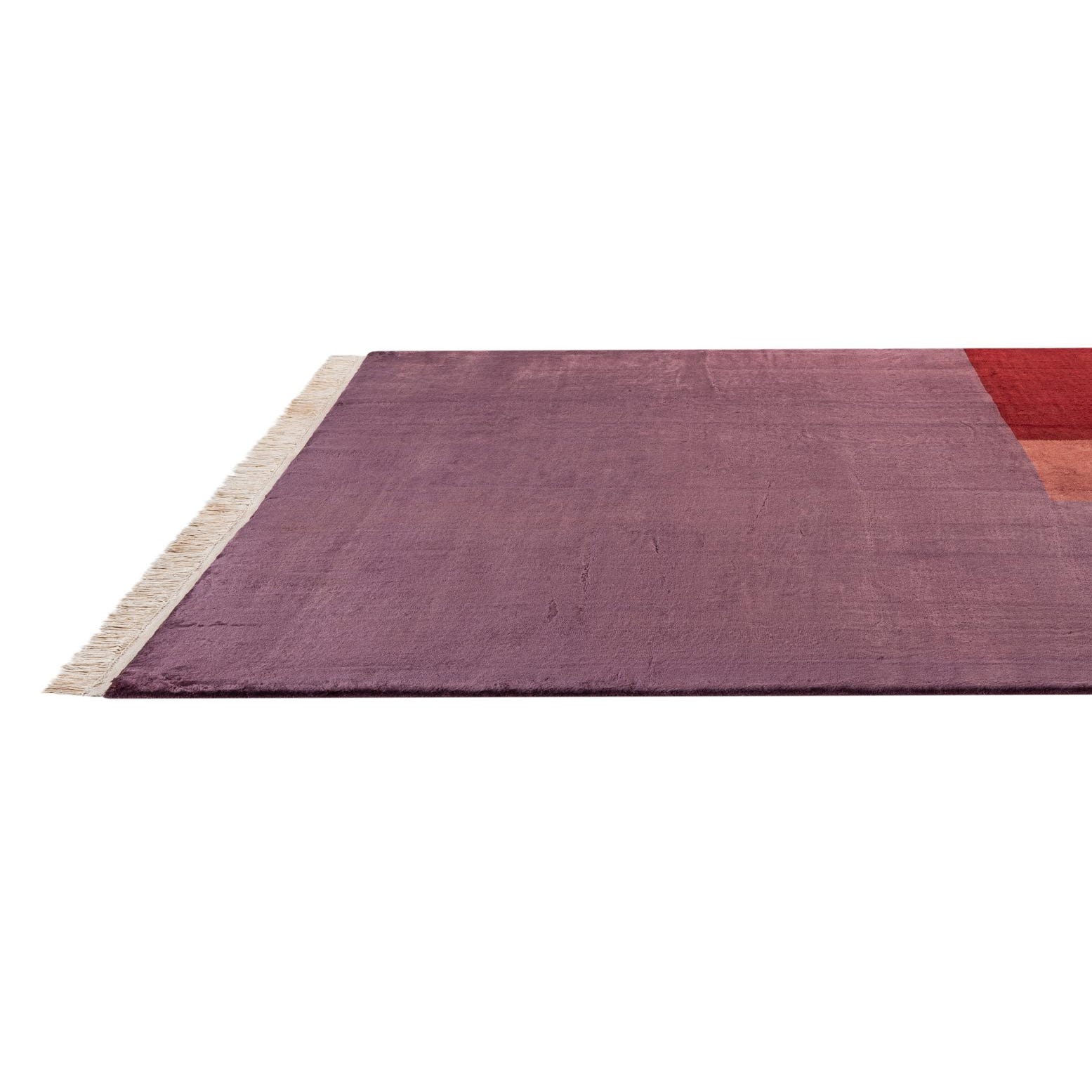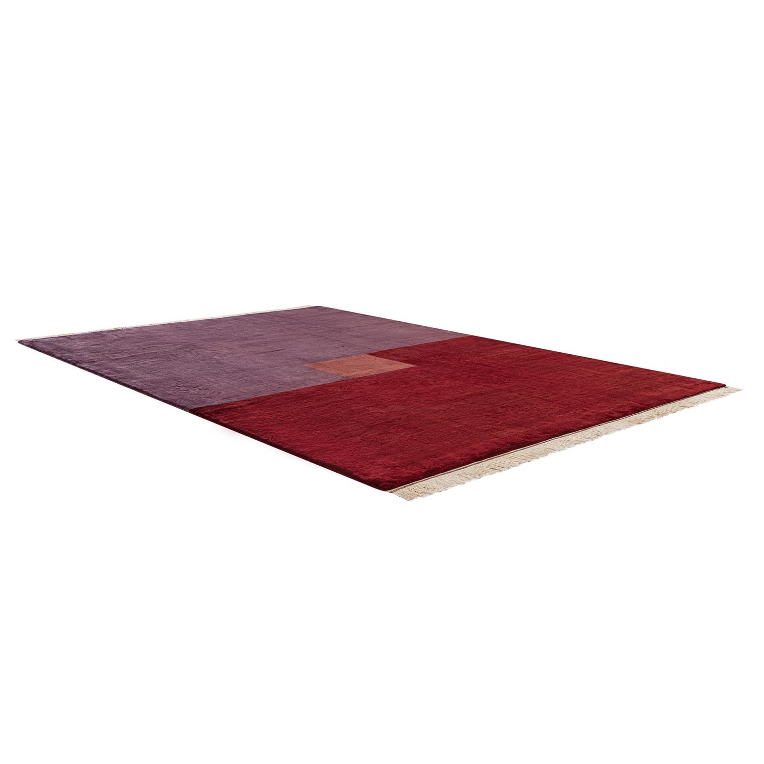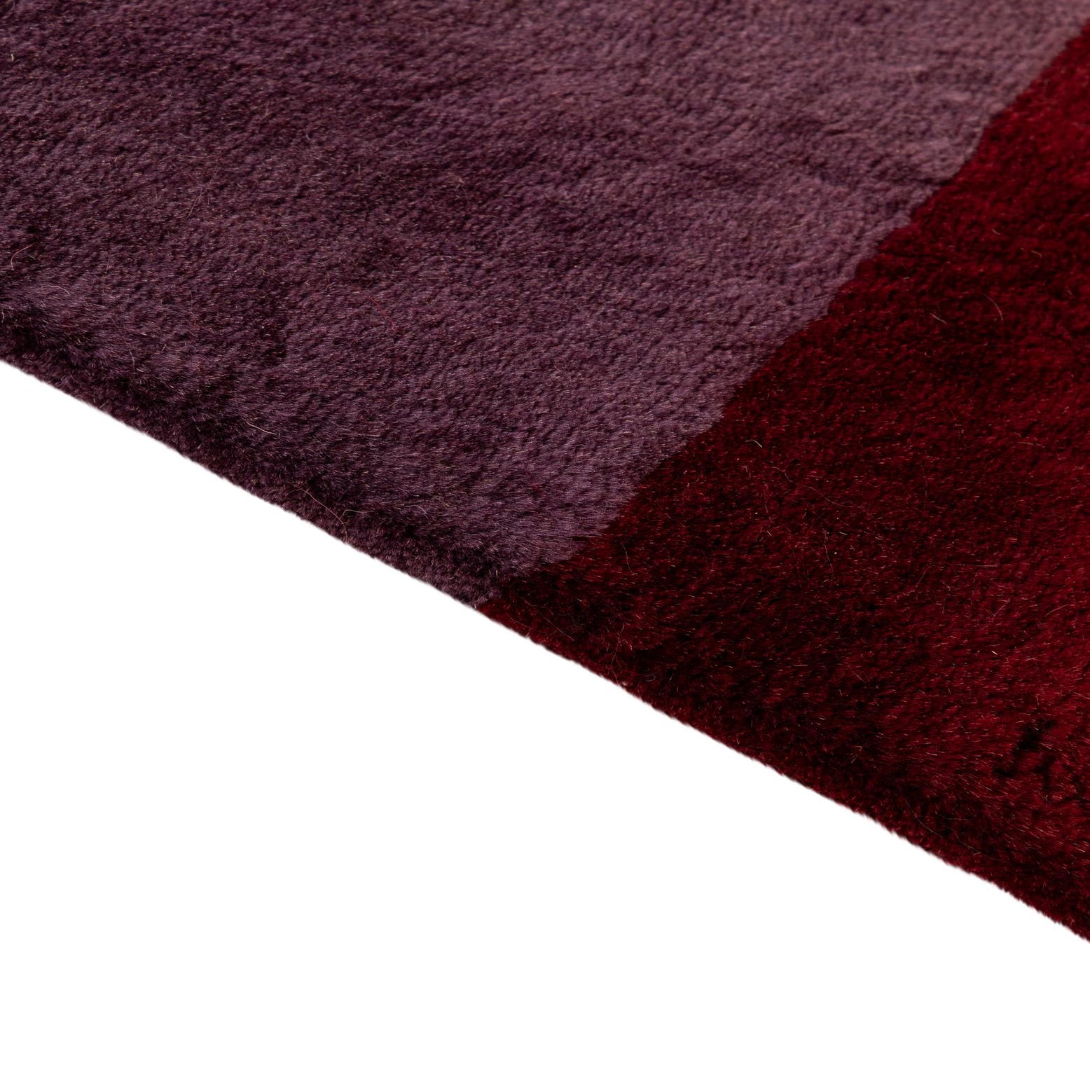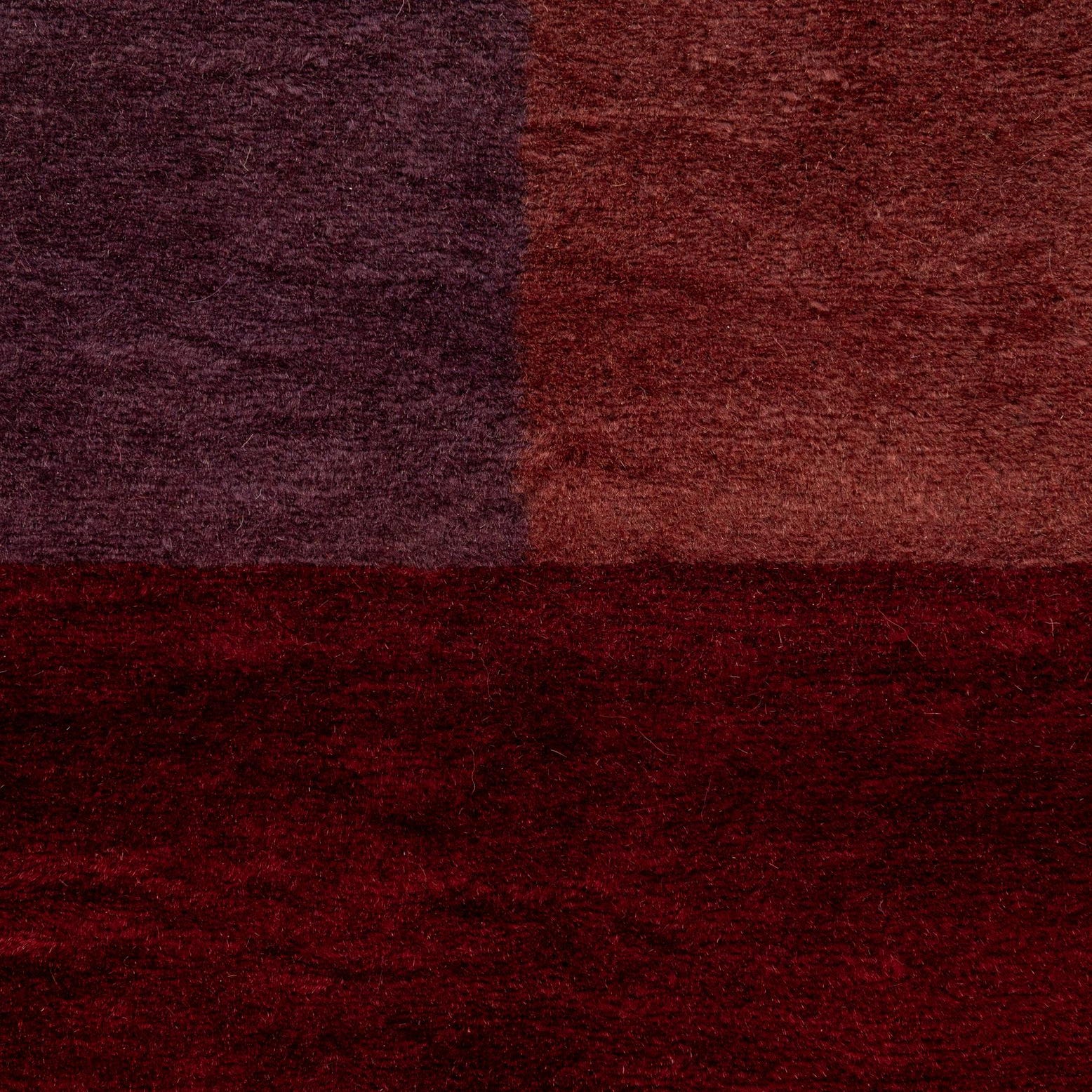 A 6x9 rectangular modern wool rug featuring a color block design with deep purple, rich red, and a smaller rust-colored rectangle.