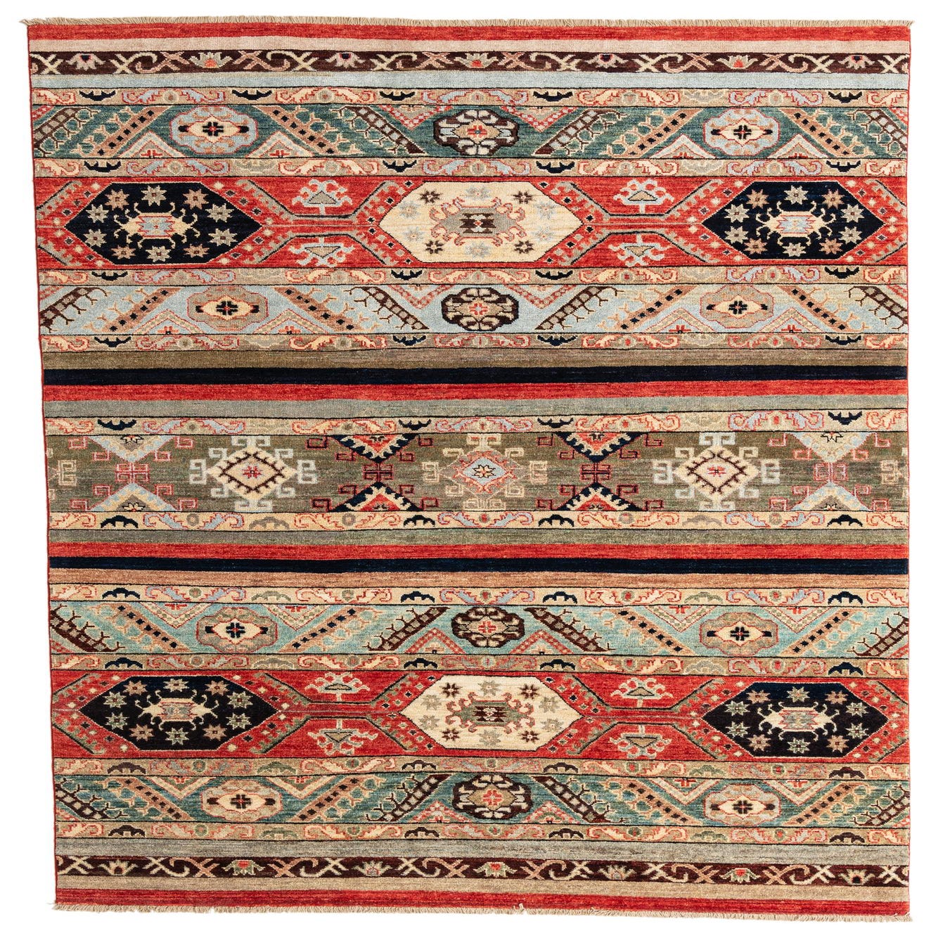 A 6x9 multi-colored rectangular Kazak rug featuring traditional geometric patterns in red, blue, green, and cream hues.