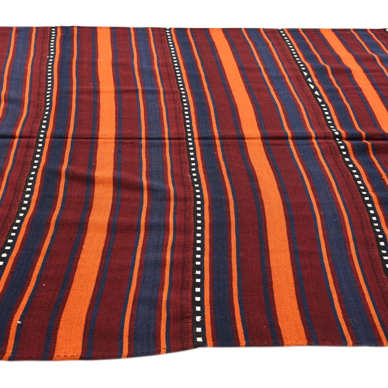 The flat-weave construction of this rug makes it a versatile addition to various interior design themes. Its rich colors and linear patterns would complement a bohemian or eclectic decor, adding warmth and character to a living space. In a more minimalist setting, this rug can serve as a singular statement piece that injects color and pattern into a subdued environment. Similarly, in a traditional or global-inspired interior, the rug's authentic hand-woven quality and cultural design roots would offer a sense of depth and history.