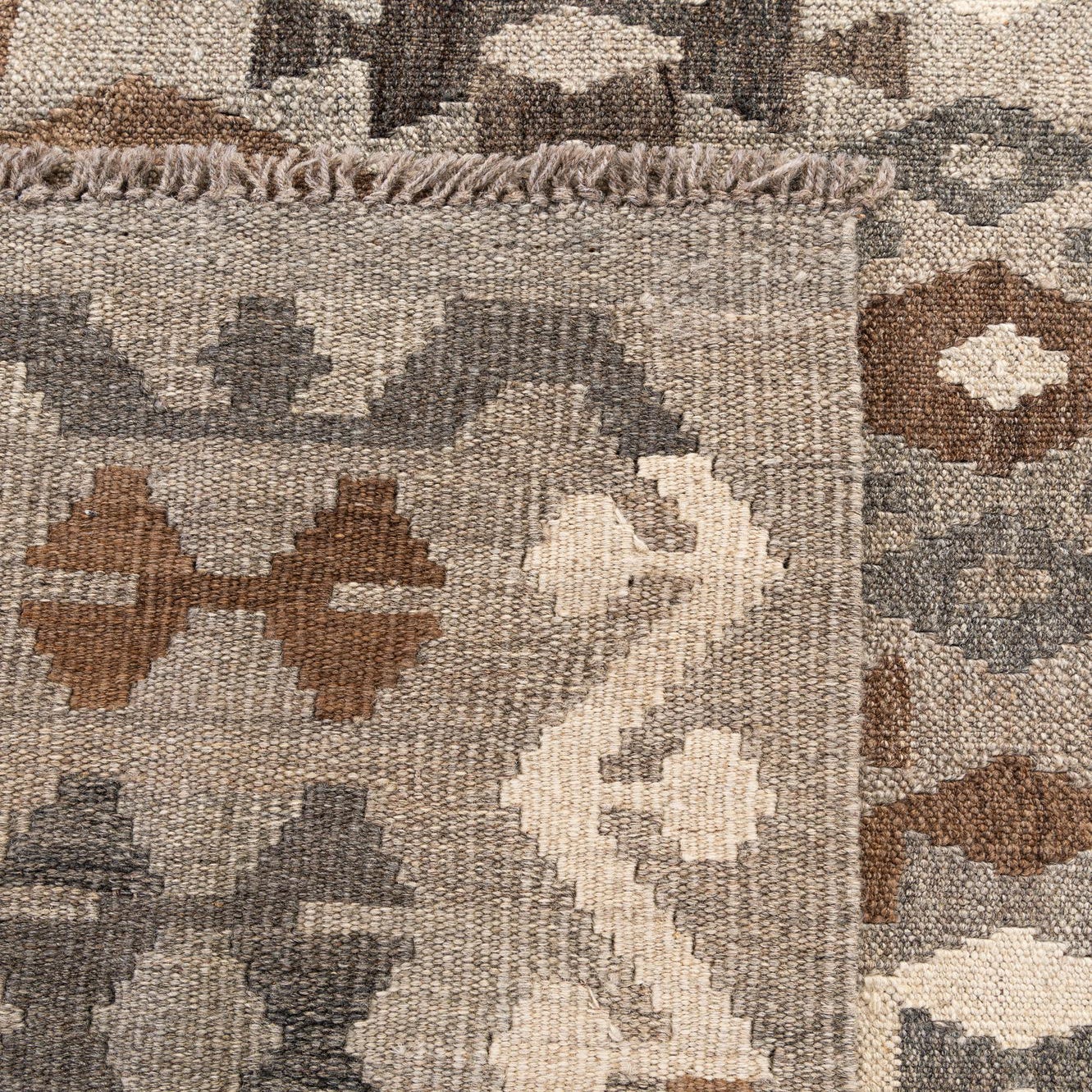 A 6x9 rectangular Kilim Maymana rug featuring a multi-colored tribal pattern with diamonds and geometric shapes in shades of brown, grey, and cream.