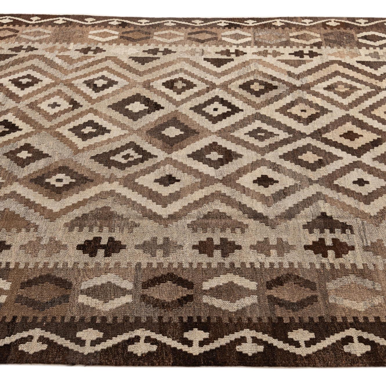 A rectangular 6x9 Kilim Maymana rug featuring a tribal geometric pattern in shades of brown, beige, and cream.