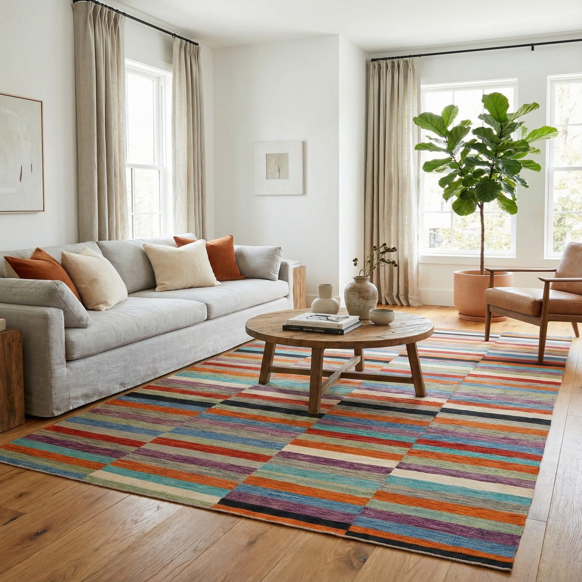 The Kilim Modern collection showcases a 6x9 hand-woven rug crafted from 100% wool. This vibrant piece features an array of colorful stripes, including beige, black, blue, brown, purple, rust red, and green, set against a multi-colored background that brings a dynamic and lively palette to any interior. The bands of color vary in width, creating visual interest and allowing for a sense of movement across the surface.