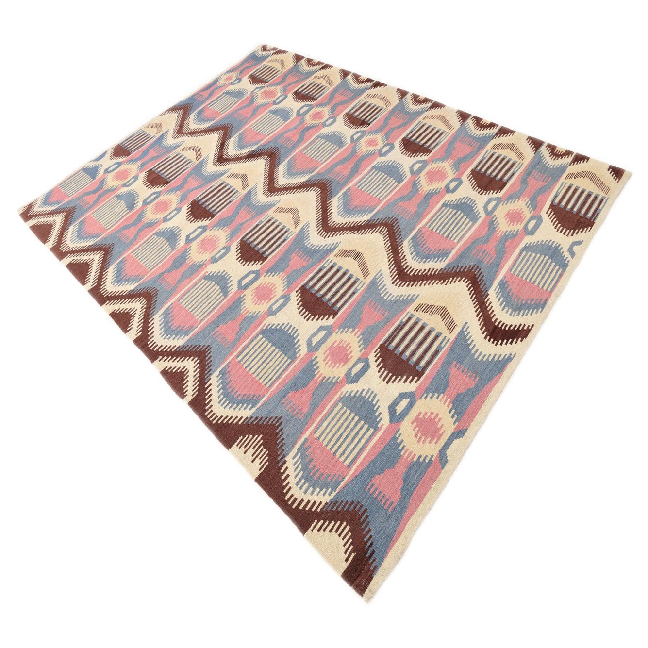 The rug features an array of colors including beige, brown, light blue, light brown, and hints of pink set against a multi-colored background, forming a dynamic and geometric pattern. This lively mix of earthy and pastel hues seamlessly blends into various decor themes, making it a versatile choice for spaces such as living rooms, study areas, or art-inspired office environments.
