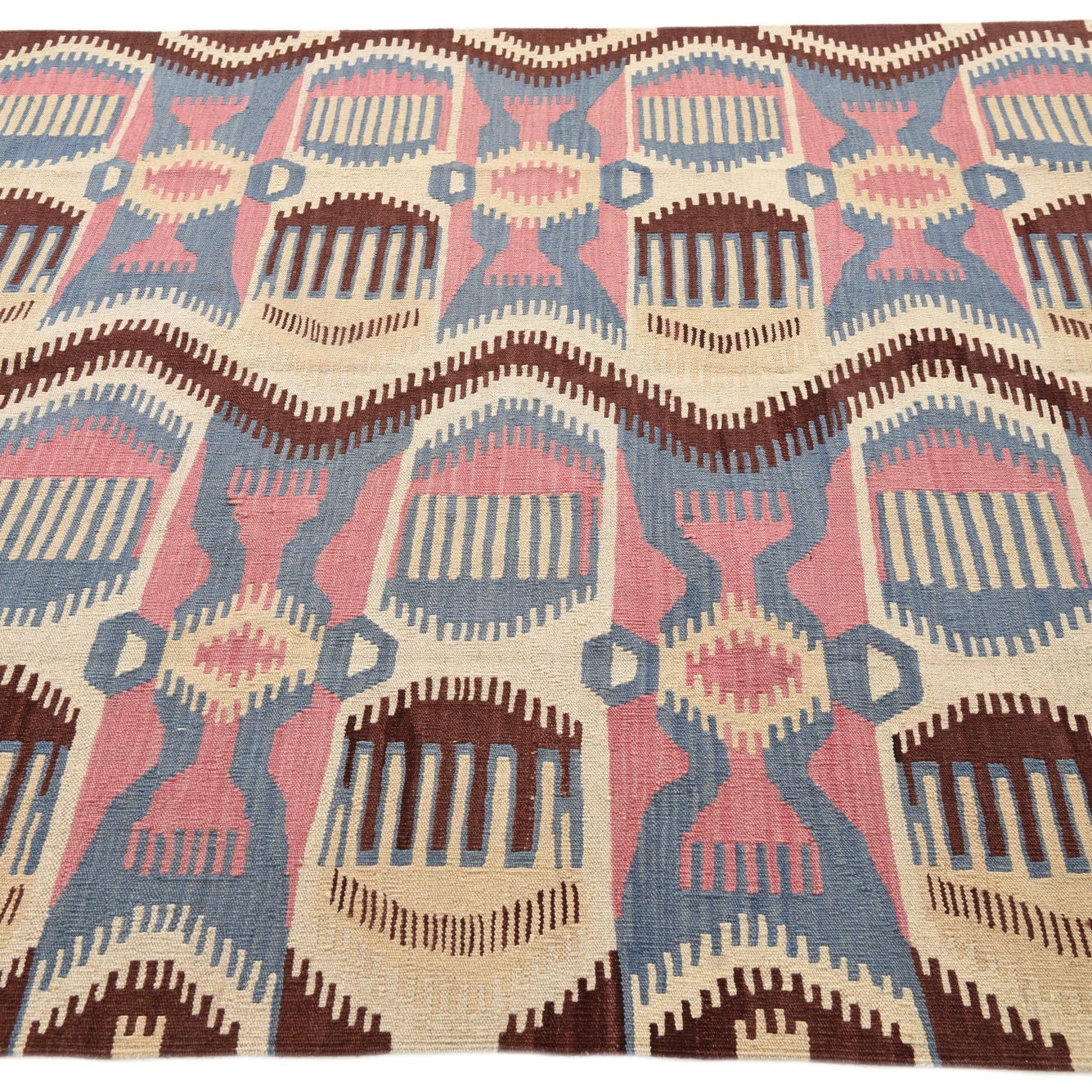 A 6x9 rectangular multi-colored tribal rug featuring abstract patterns in blue, pink, brown, and cream, ideal for a living room.