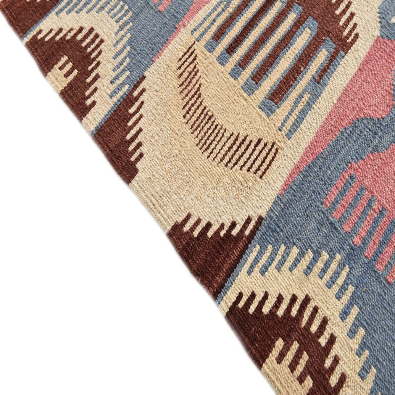 This Kilim Modern collection rug showcases a distinctive pattern that draws from traditional Kilim designs, incorporating modern colorways to create a compelling piece suitable for a range of interior styles. The handwoven 100% wool construction ensures both durability and a comforting underfoot texture.