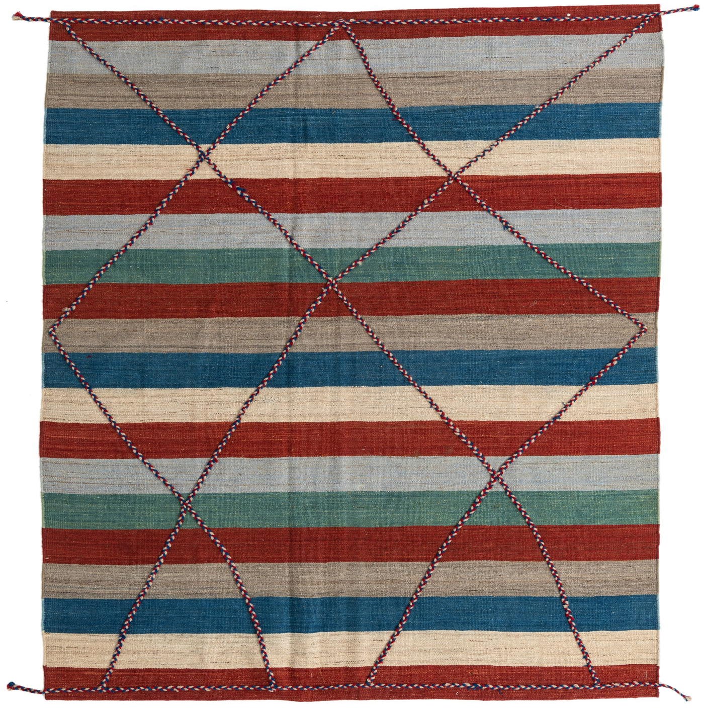 A 6x9 rectangular multi-colored flatweave wool rug with horizontal stripes and a diamond pattern created by braided cords.