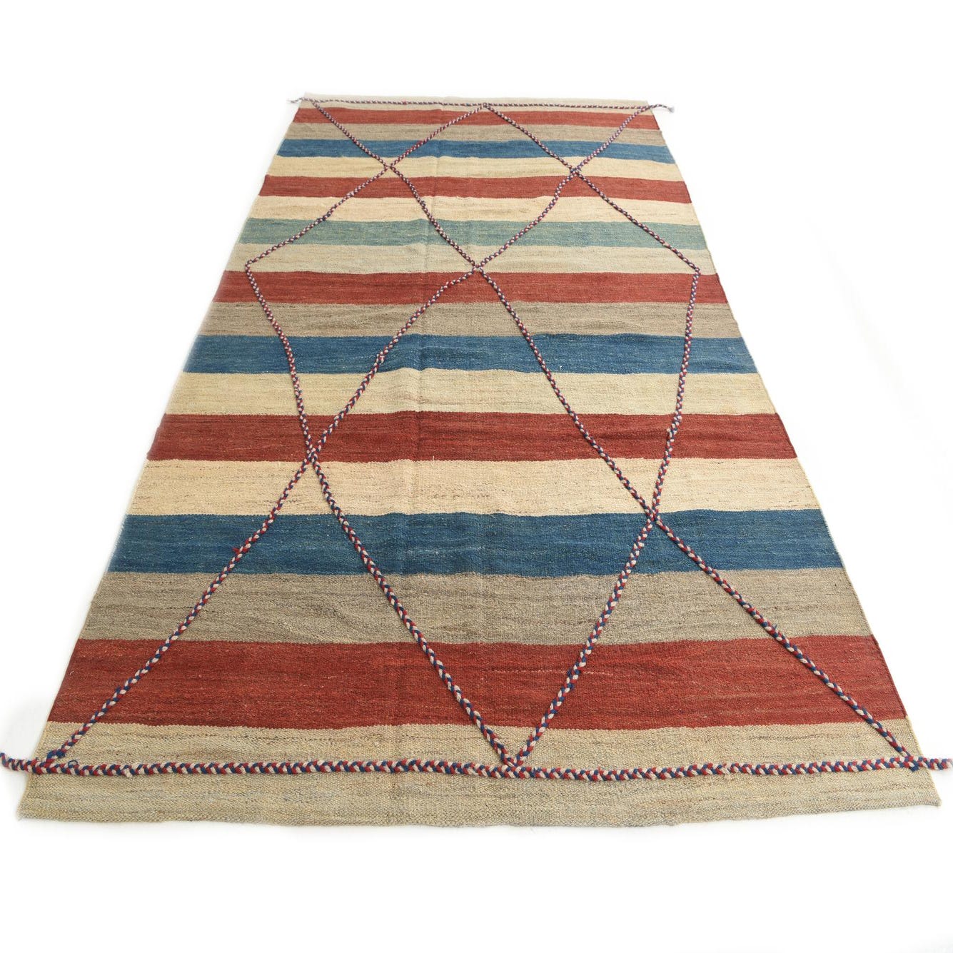 A 6x9 rectangular multi-colored tribal flatweave rug with horizontal stripes in red, blue, beige, and grey, accented by a diagonal braided pattern.
